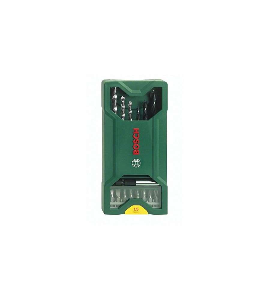 Set di punte e bit avvitamento Bosch Mini-X-Line. 15 pezzi totali: 3 punte di alta qualità per legno e 3 muratura, 8 bit per diversi formati di vite e portabit magnetico per cambi rapidi. Custodia pratica per un'organizzazione ottimale.Altro 1:
