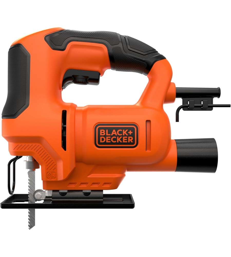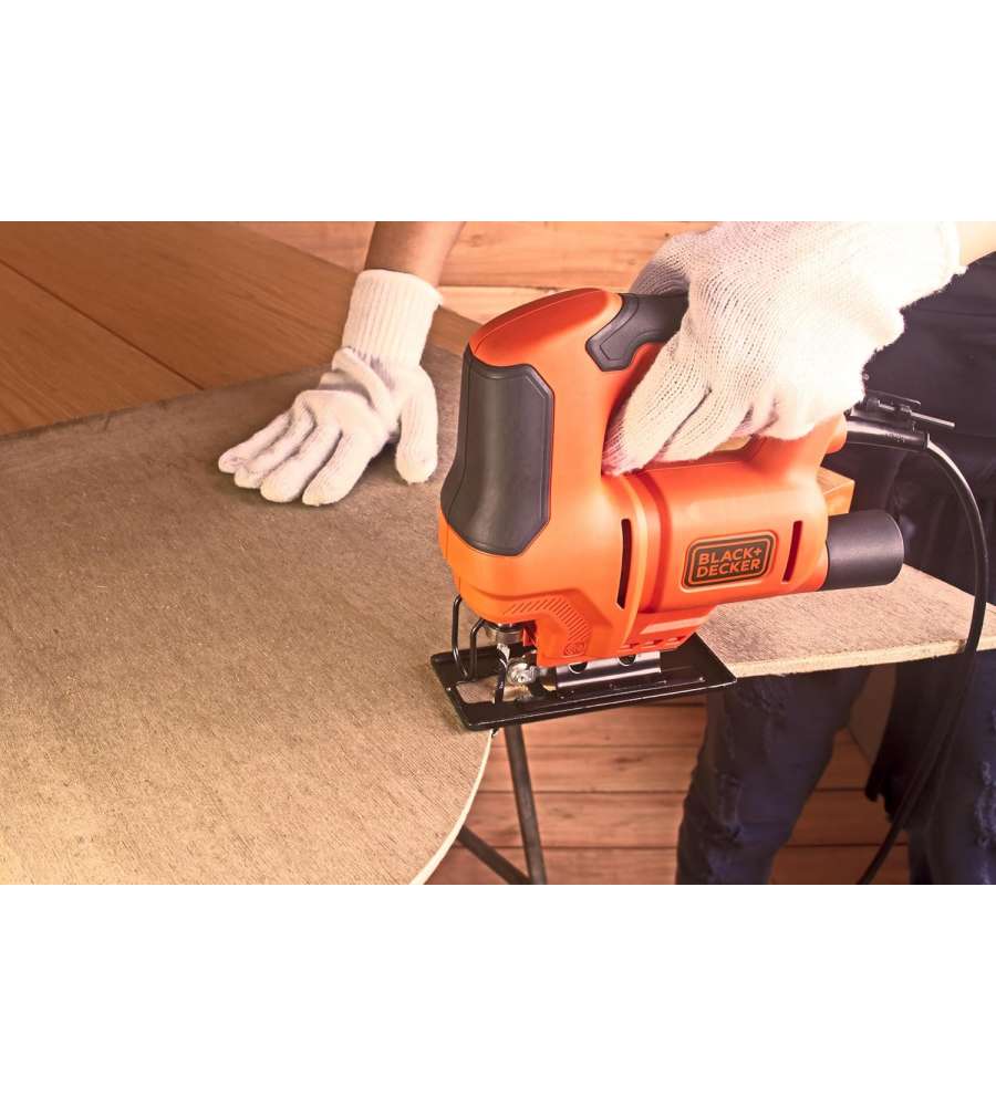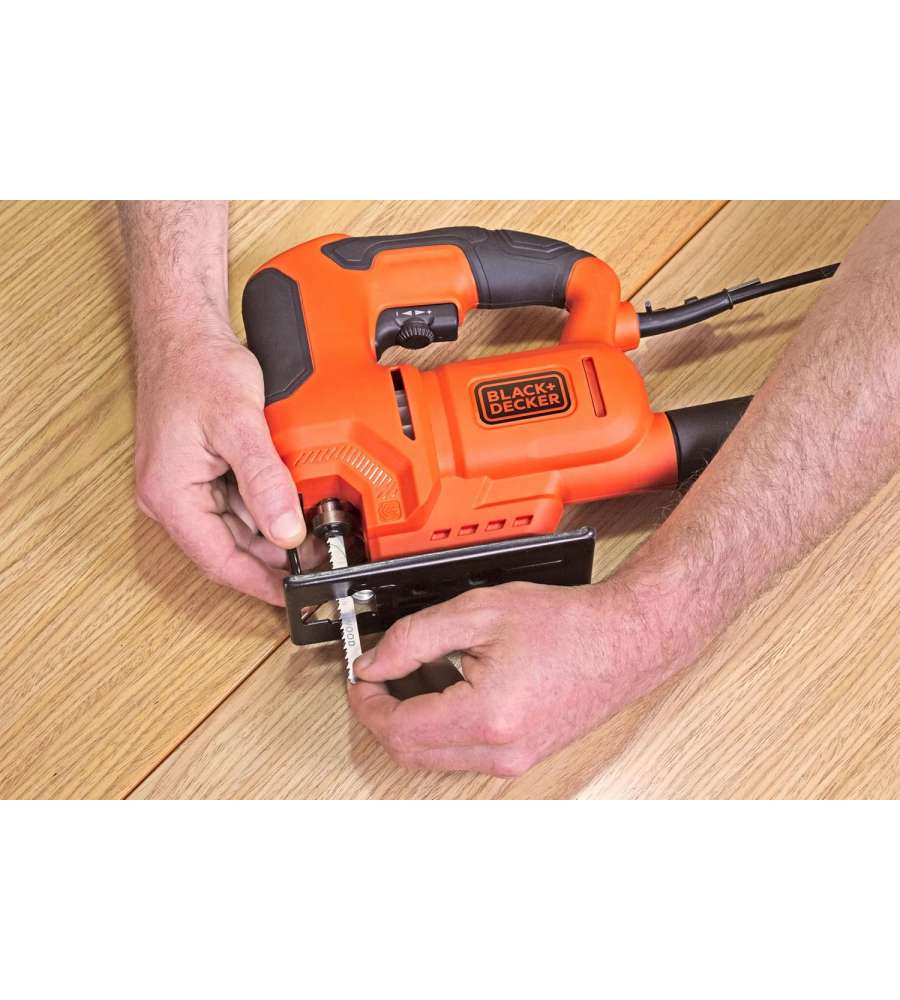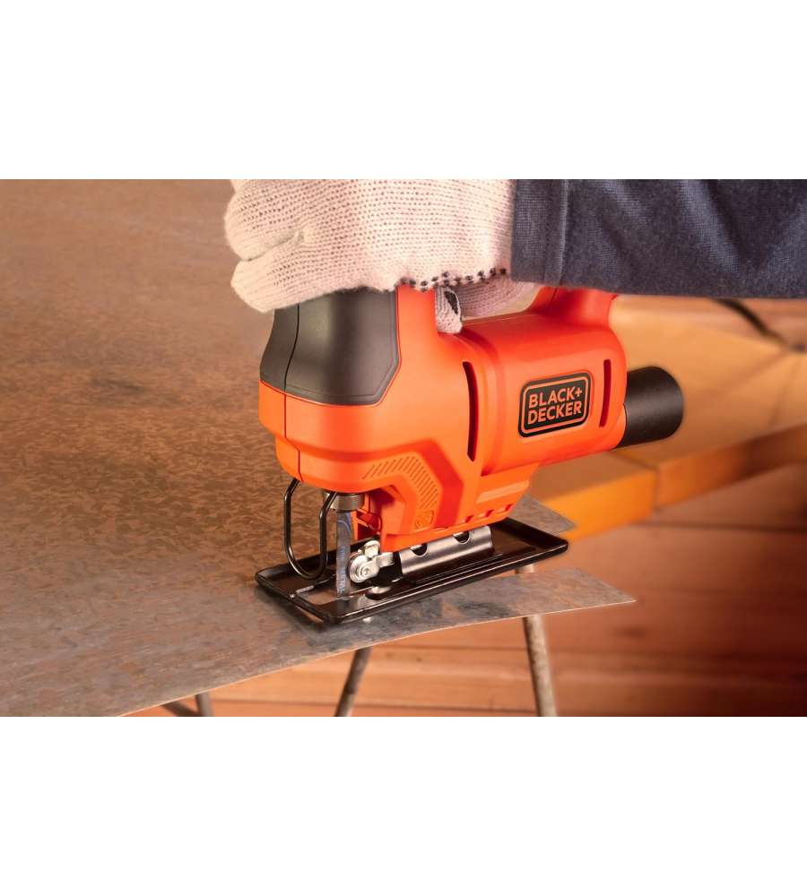 Seghetto alternativo Black+Decker 400W con 6 lame incluse. Tagli fino a 65mm nel legno, 6mm nel metallo. Cambio lama rapido, impugnatura ergonomica e funzione di soffiaggio polvere per visibilità. Fino a 3000 cpm.Altro 1: