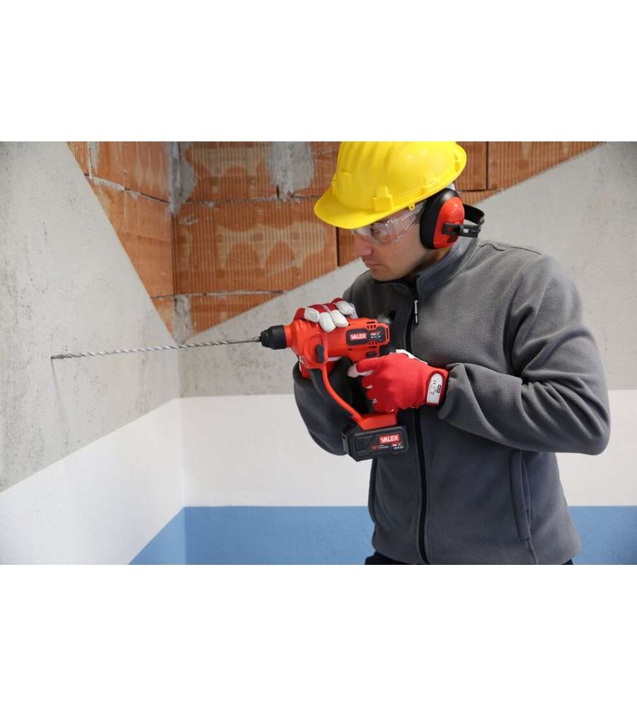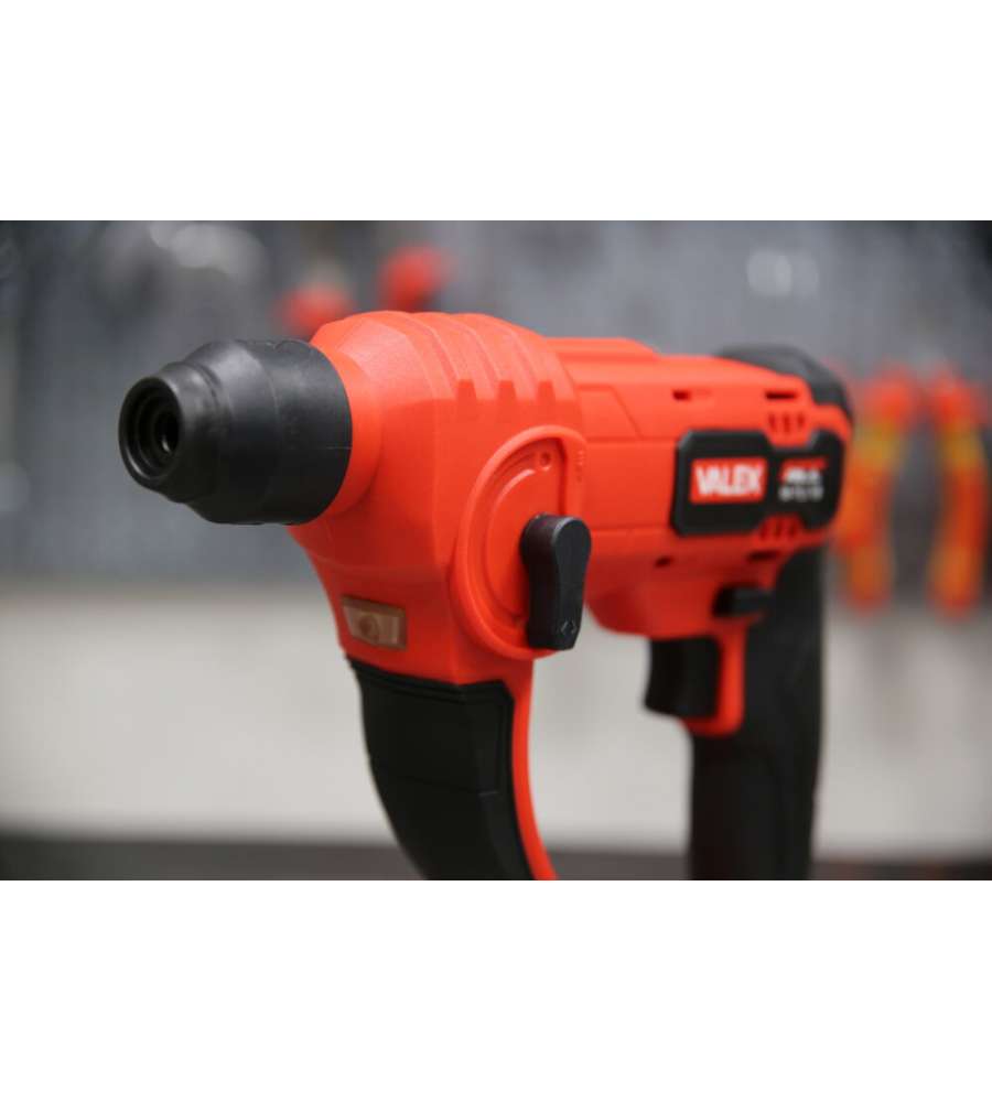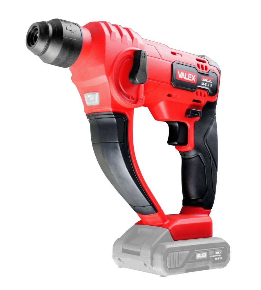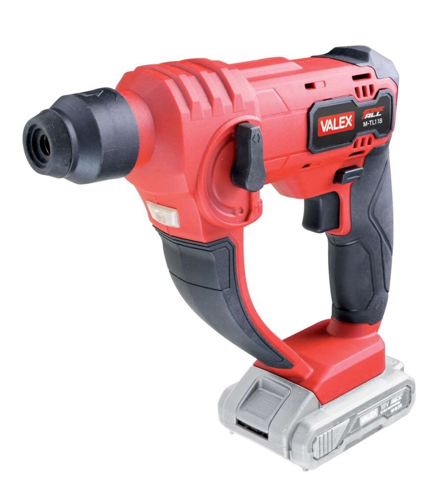 Tassellatore a batteria 18V Valex M-TL1, potenza colpo 1,3J, 6000 colpi/min, attacco mandrino SDS PLUS, diametro foro muratura 12mm. Impugnatura morbida, luce LED integrata, massa battente pneumatica. Batteria e caricabatteria non inclusi.Altro 1: