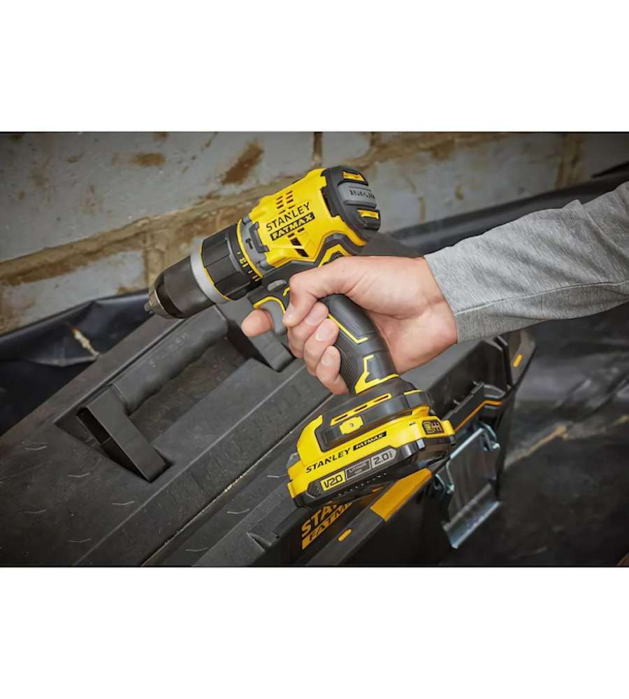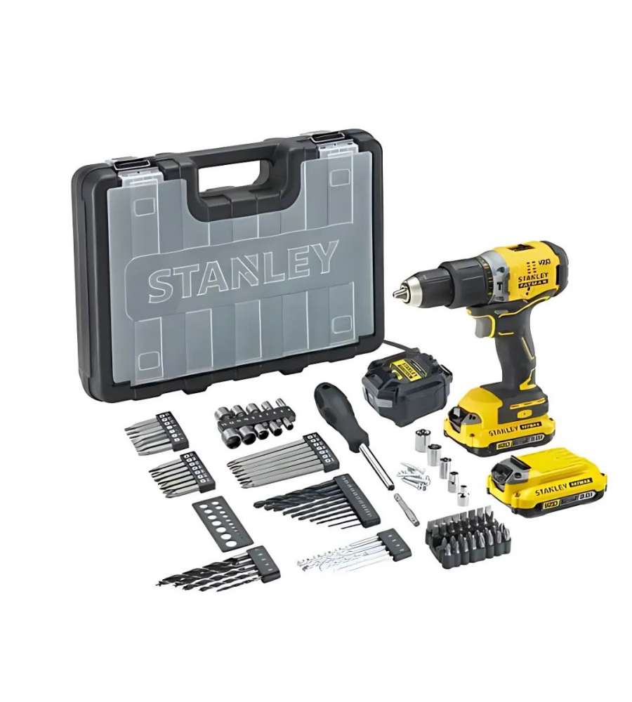 Descrizione: Kit Trapano Avvitatore Percussione 18V motore Brushless Stanley Fatmax con 2 batterie da 2Ah e valigetta da 100 accessori. Potente motore, coppia 60 Nm, illuminazione LED e mandrino senza chiave per un lavoro preciso e veloce.