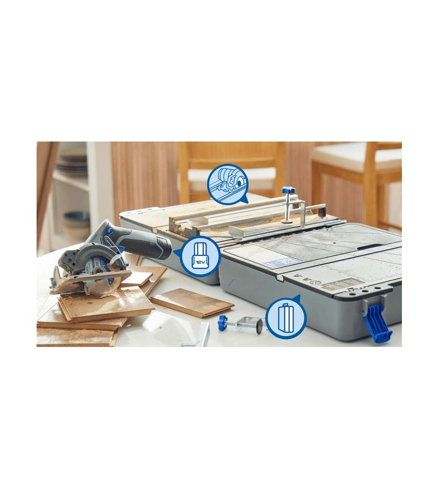 Valigetta, Banco sega, Compact Saw, 1 lama multi-material 85mm, Guida per laser perpendicolari, Adattatore per aspirazione, Ripiani di lavoro, Morse, Batteria 12V 2Ah, CaricabatteriaCaratteristiche: