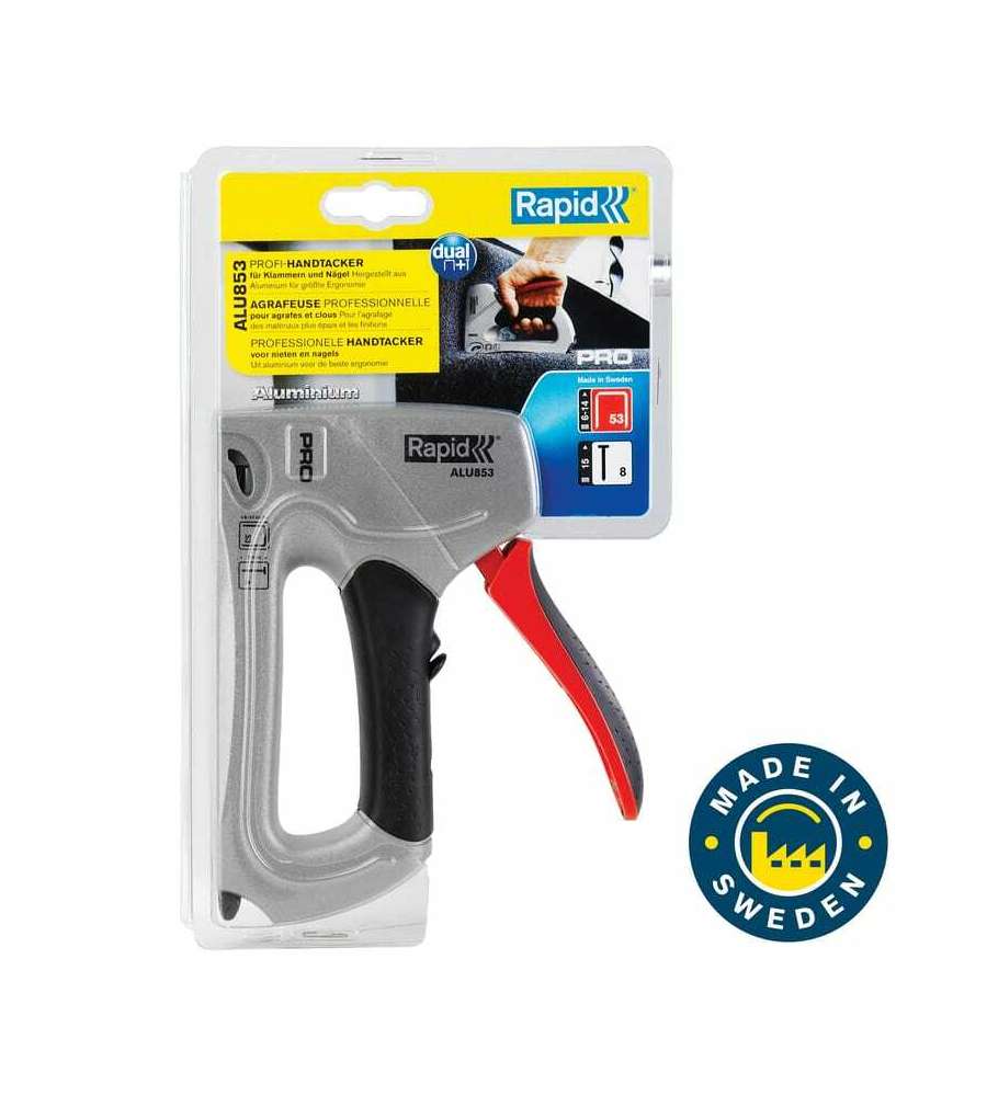 Descrizione: Graffatrice ALU853, potente e versatile, ideale per fissaggi professionali di tessuti, isolanti e modanature. Per graffe a filo fine Rapid 53 (6-14mm) e chiodi Rapid 8 (15mm). Corpo in alluminio e impugnatura ergonomica.