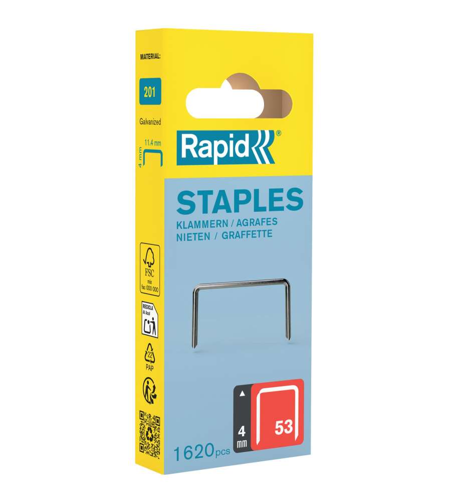 Descrizione: Graffe Rapid N.53 da 4 mm in acciaio zincato, confezione da 1600 pezzi. Ideali per fissare tessuti, decorazioni ed etichette. Filo fine per una penetrazione ottimale e minima visibilità. Perfette per uso fai-da-te.