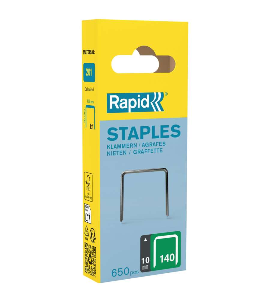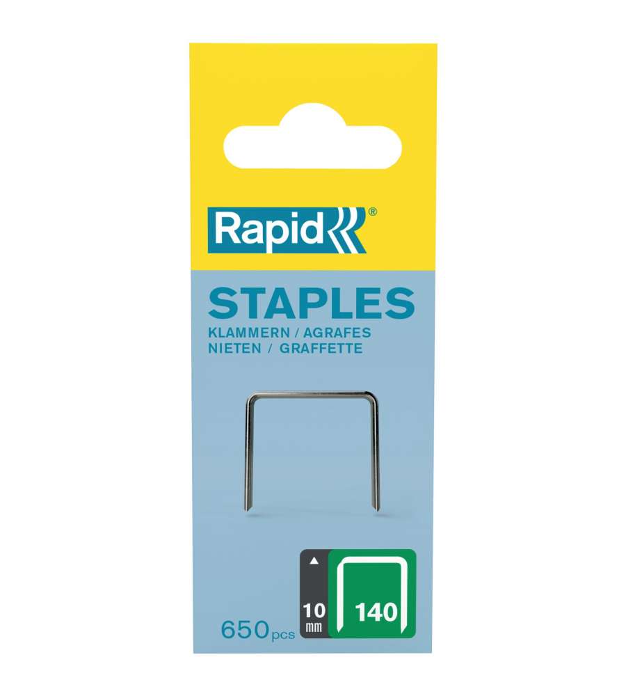 Descrizione: Scopri le graffe Rapid N.140 da 10 mm in acciaio zincato, ideali per fissare plastica, cartone e materiali isolanti. Confezione da 650 graffe per un lavoro preciso e duraturo. Fissaggio sicuro e resistente!