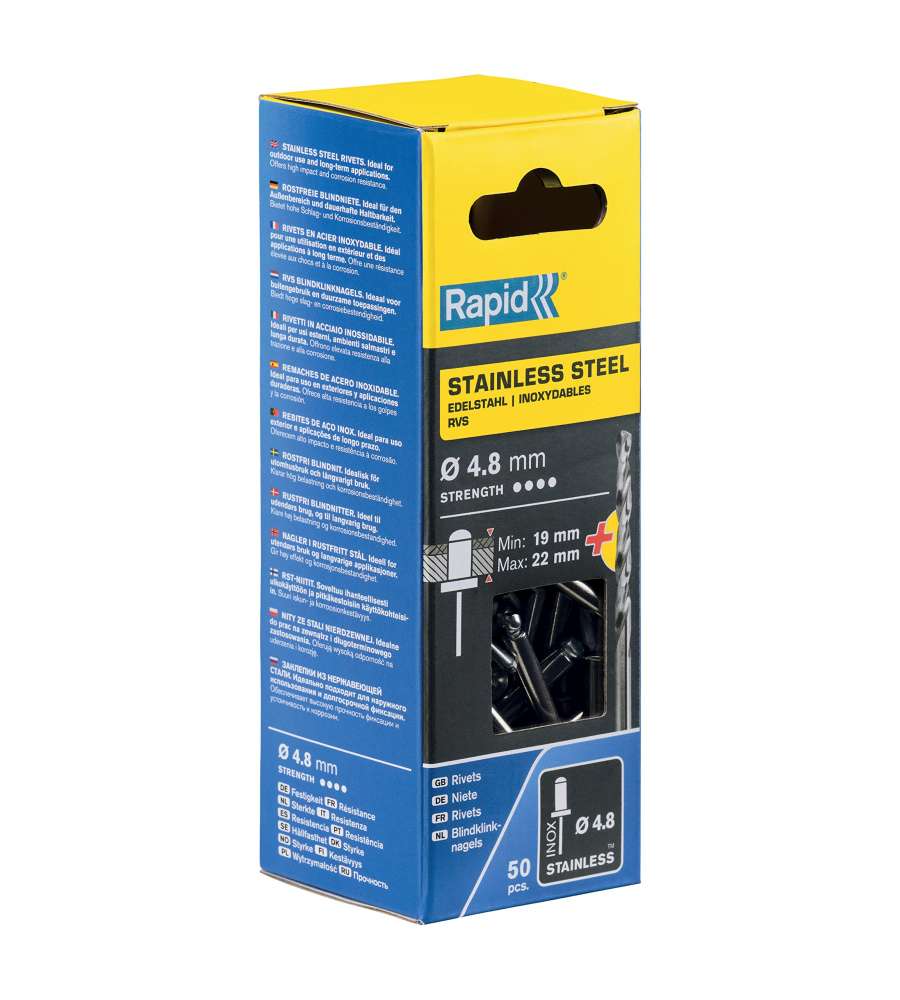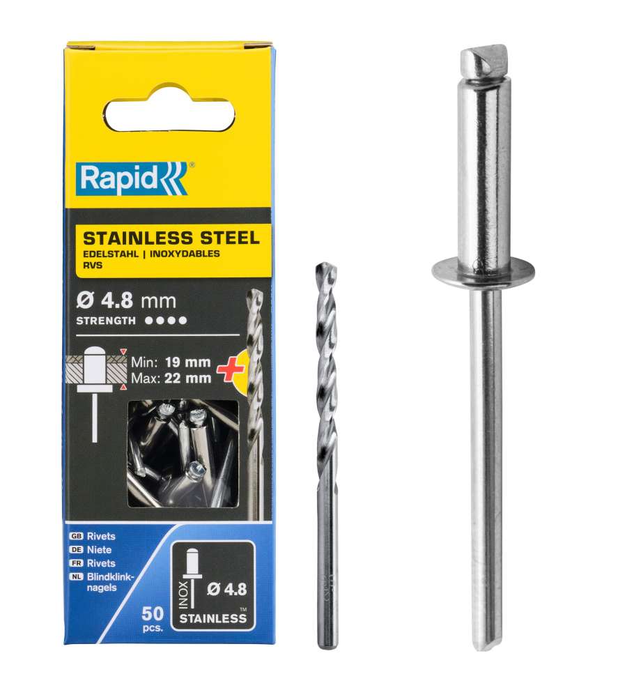 Rivetti in acciaio inox Ø 4,8 x 25 mm, resistente alla corrosione, ideale per fissaggi esterni. Include 50 rivetti e punta per trapano. Adatti per materiali fino a 22 mm di spessore. Compatibili con pinze Rapid. Lunga durata garantita.Garanzia: