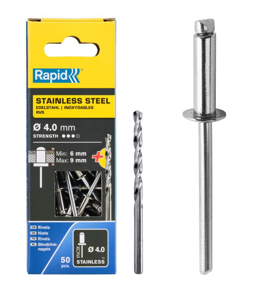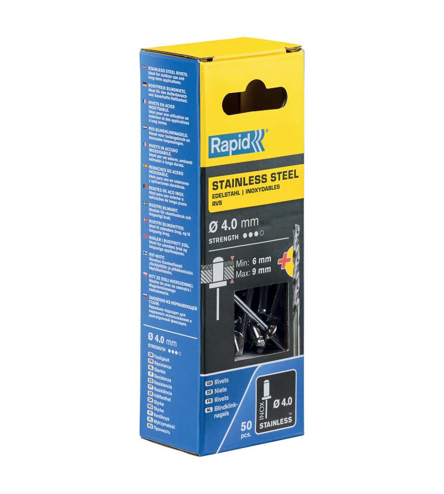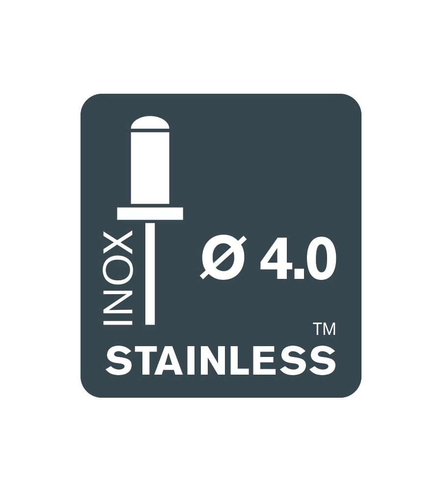 Rivetti in acciaio inox Ø 4 x 12 mm, resistenti alla corrosione, ideali per fissaggi in esterni e materiali fino a 9 mm di spessore. Confezione da 50 pezzi e punta trapano inclusa. Compatibili con strumenti Rapid per prestazioni ottimali.Garanzia: