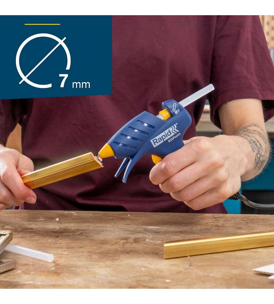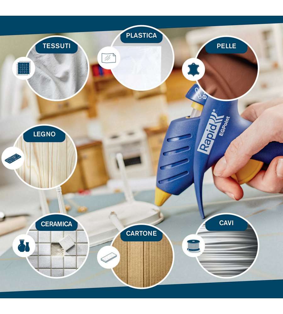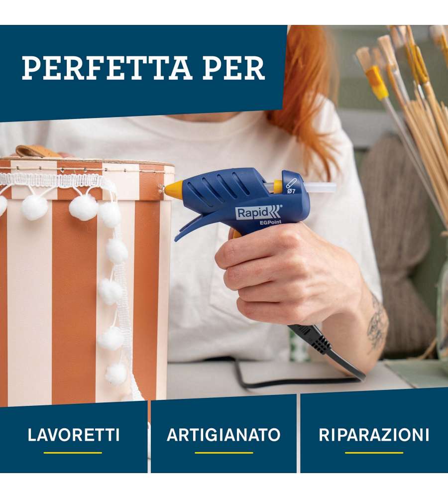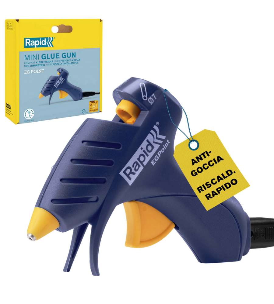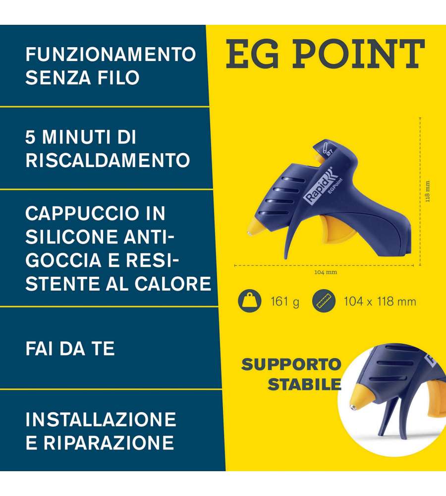 Descrizione: Pistola per colla a caldo senza fili Rapid EG Point, con ugello di precisione per applicazioni dettagliate. Riscaldamento rapido in 5 min, autonomia di 7 min. Ideale per fai da te e piccole riparazioni.