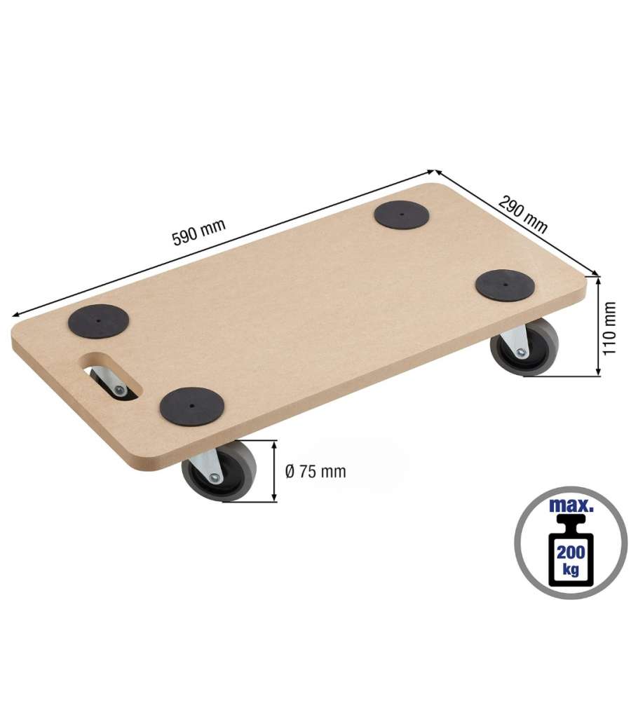 Carrello a pianale in MDF con ruote in plastica, portata massima 200 kg. Dotato di 4 supporti antiscivolo per sicurezza. Ideale per trasporti in magazzino e uso industriale. Robustezza e praticità in un unico prodotto.Altro 1: