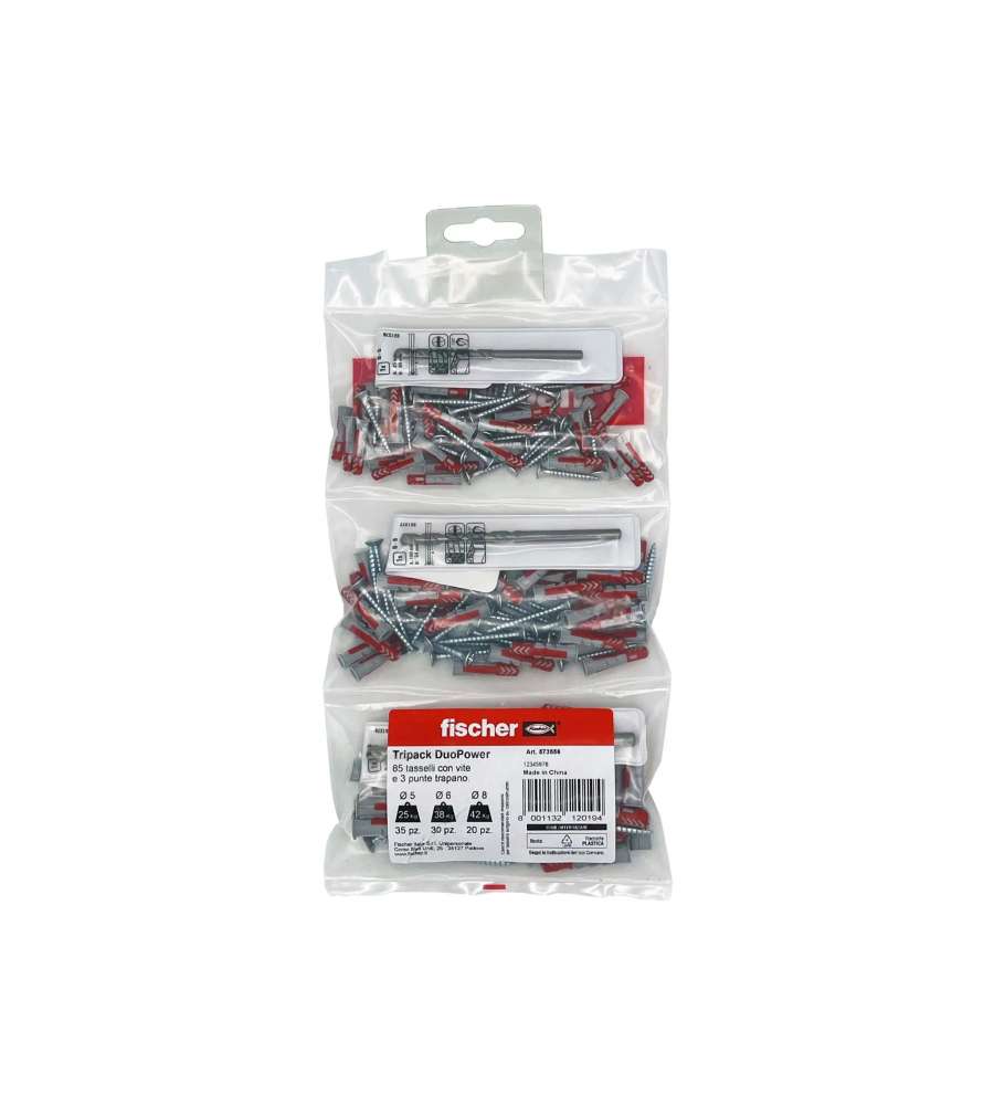 Descrizione: Kit Fischer Tripack DuoPower con 85 pezzi di viti diametro 5-6-8 mm, ideale per fissaggi sicuri e versatili. Include tasselli universali e punte per muratura, perfetto per ogni progetto fai-da-te.