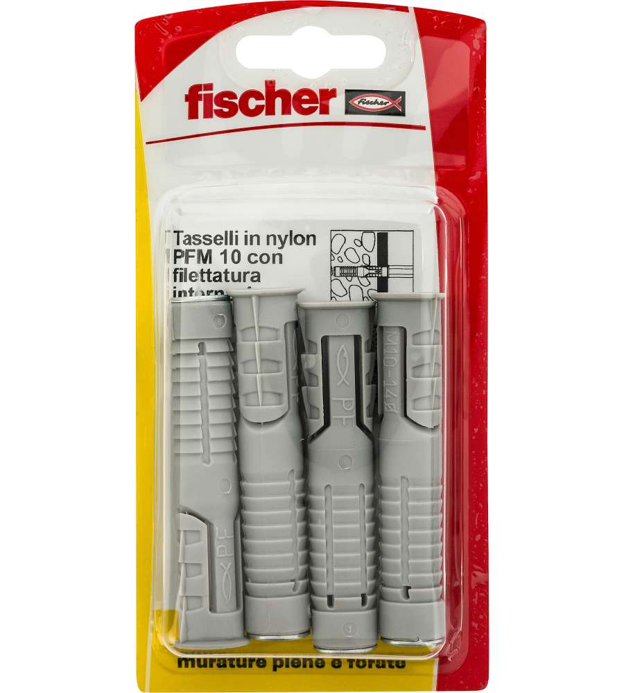 Fischer Tasselli PFM 10 K per reggi mensola a scomparsa: set di 4 pezzi in nylon, ideali per fissaggio invisibile di mensole su murature piene e forate. Lunghezza 73 mm, diametro 14 mm, peso 38 g.