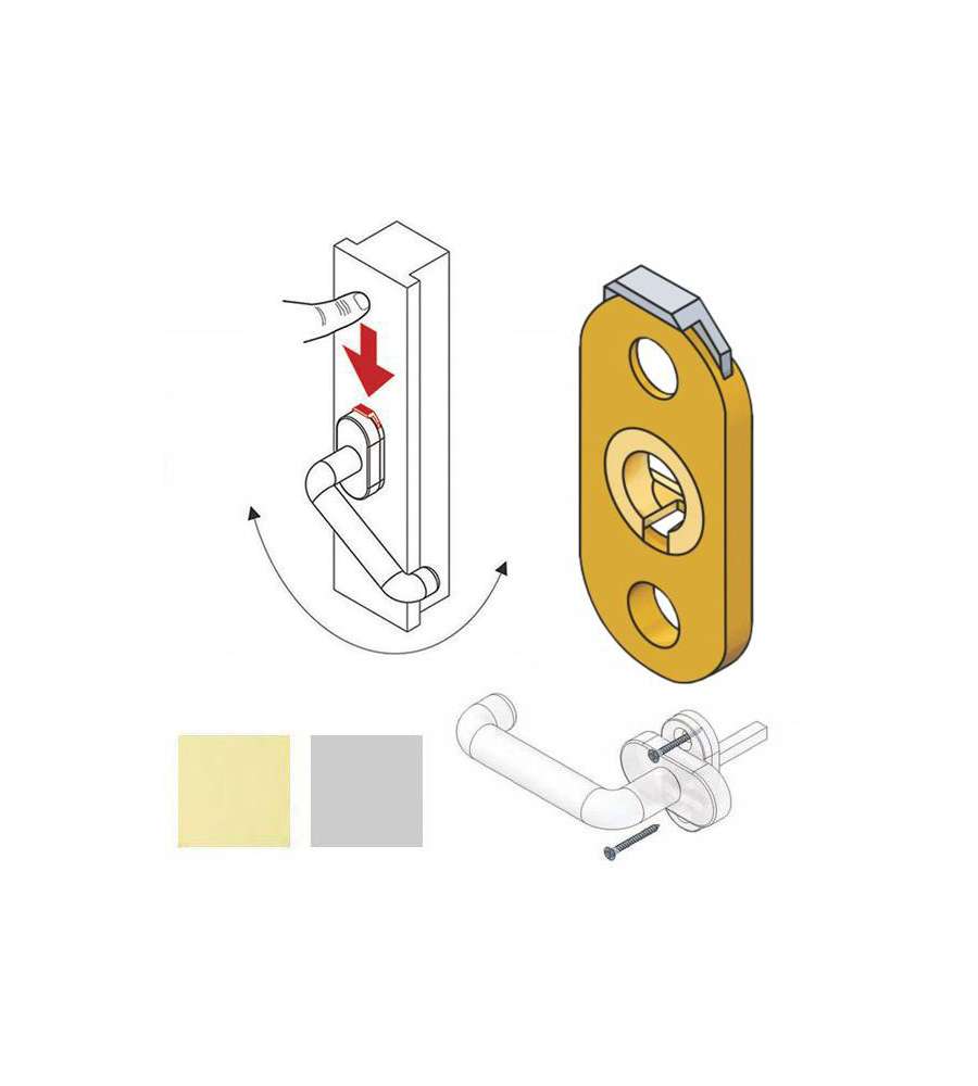 Dispositivo di sicurezza per porte e finestre, design ovale, dimensioni 65x30 mm, spessore 5 mm. Apertura sicura tramite pulsante, interassi fori 43 mm, quadro maniglia 7 mm. Colore silver, installazione facile e senza attrezzi.Altro 1: