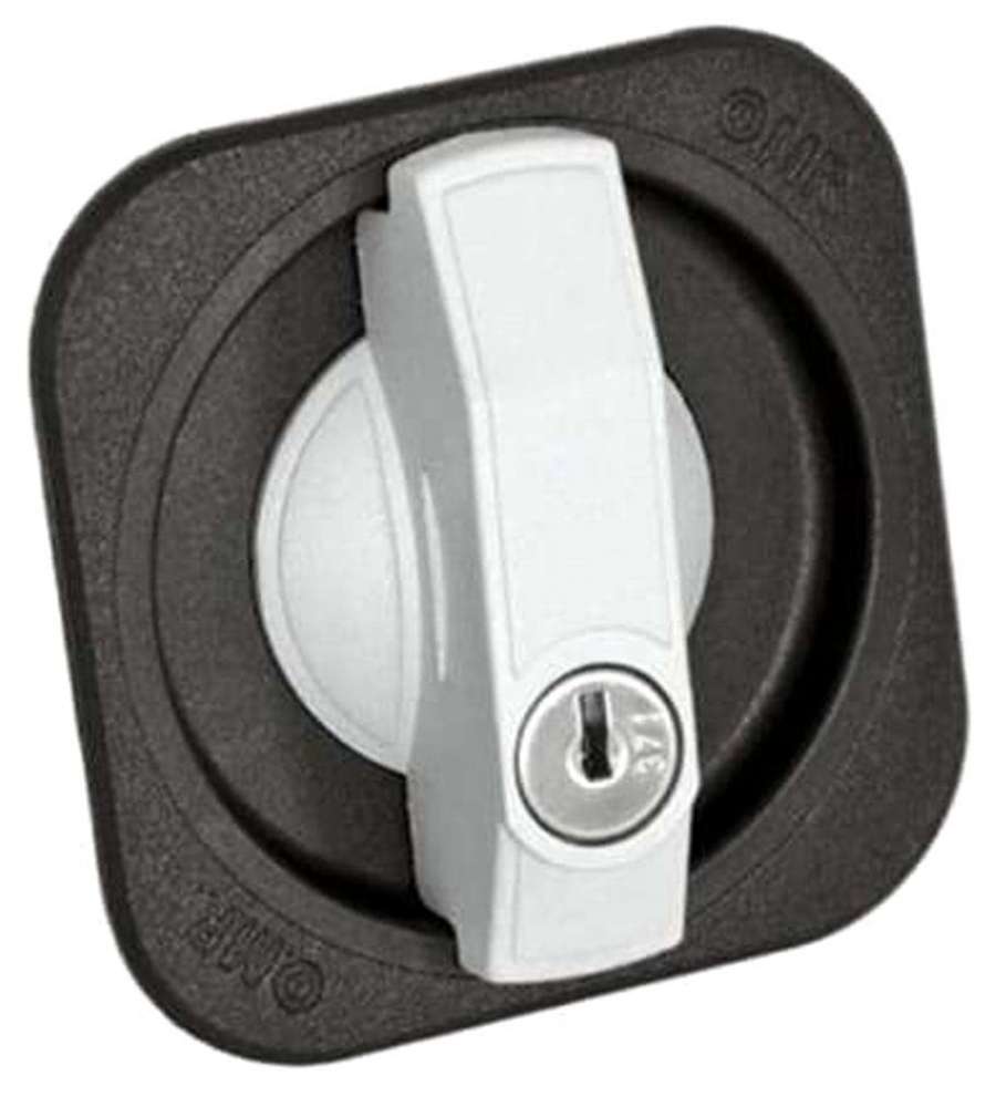 Descrizione: Serratura per mobili OMR, in plastica nera con maniglia metallica. Chiusura a chiave con rotazione a 90°, dimensioni 85x85 mm. Include 2 chiavi, ideale per antine e porte a battente.