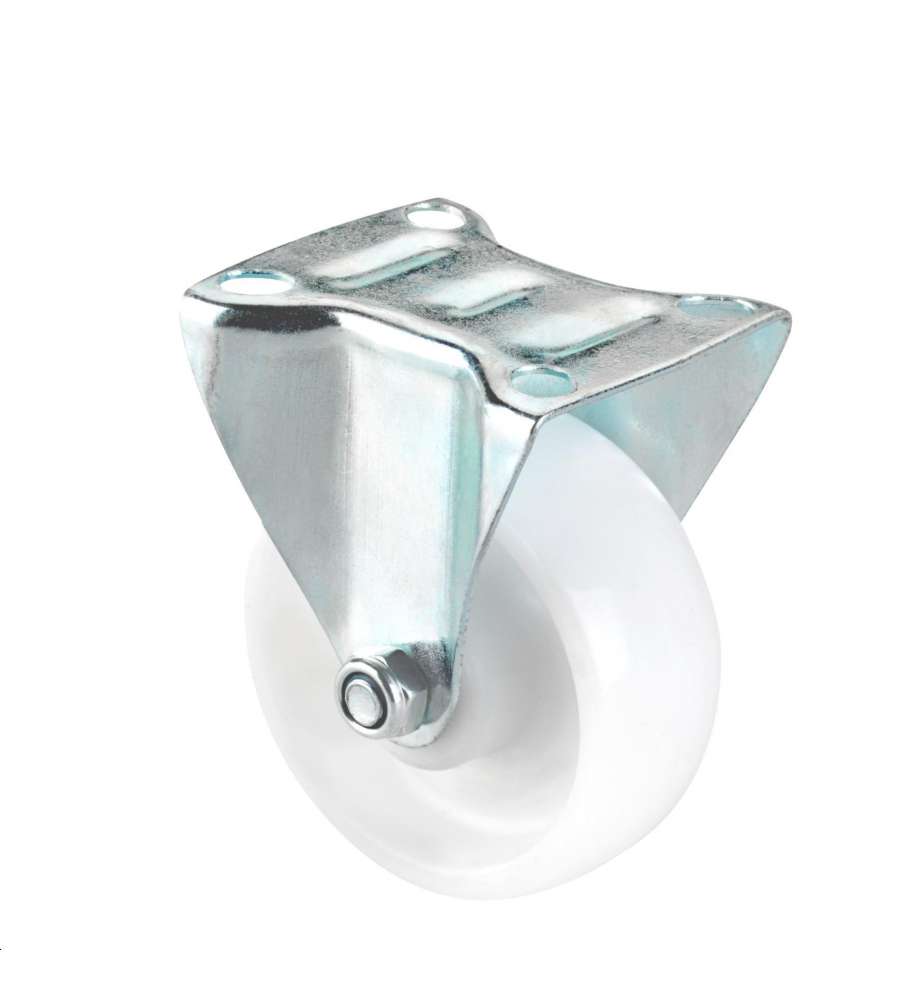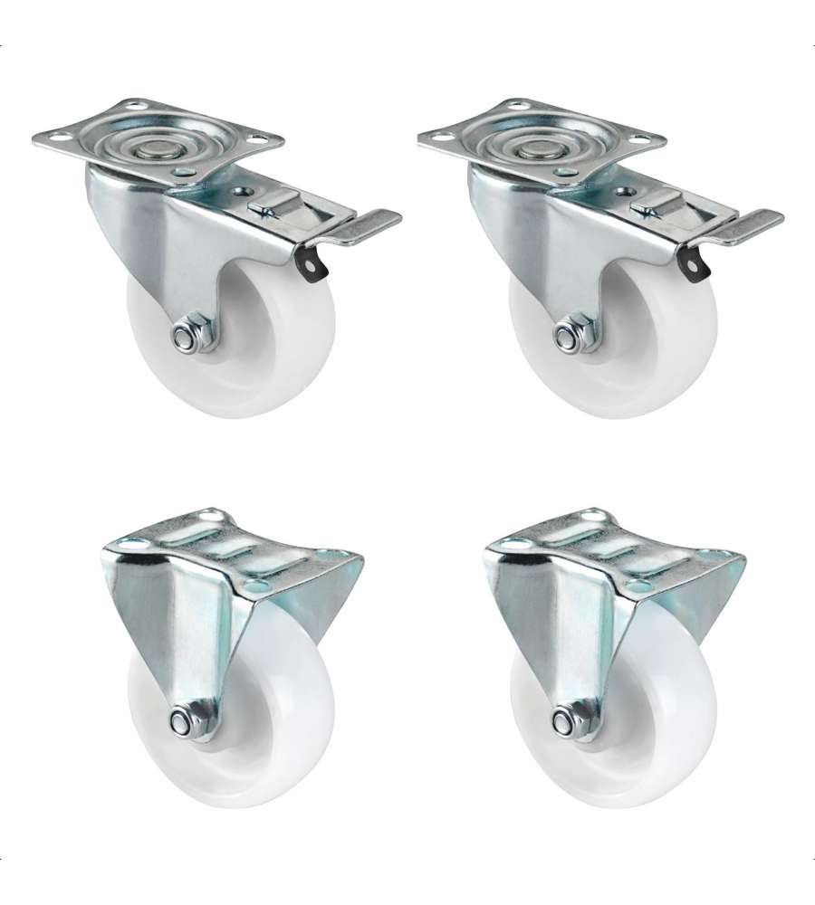 Set di ruote professionale composto da 2 ruote fisse e 1 elevatore, con capacità di carico fino a 200 kg. Realizzate in acciaio zincato e poliammide, diametro ruota di 75 mm. Montaggio semplice, adatte a pavimenti robusti.Altro 1: