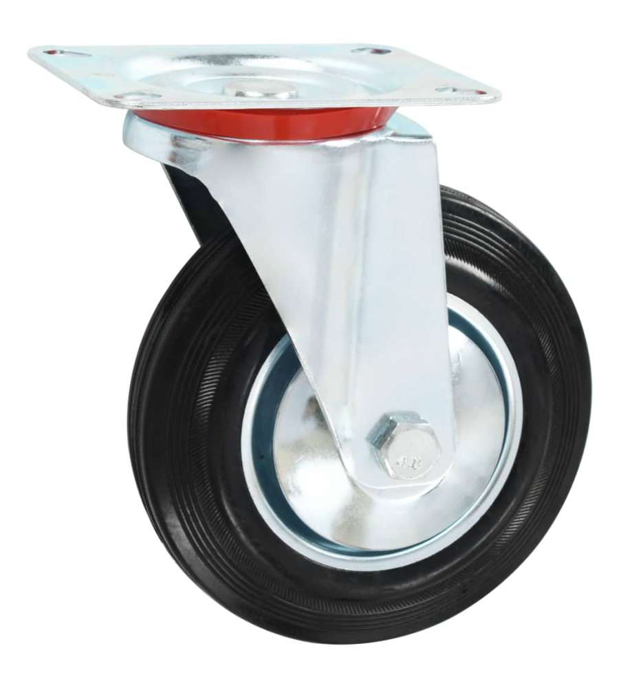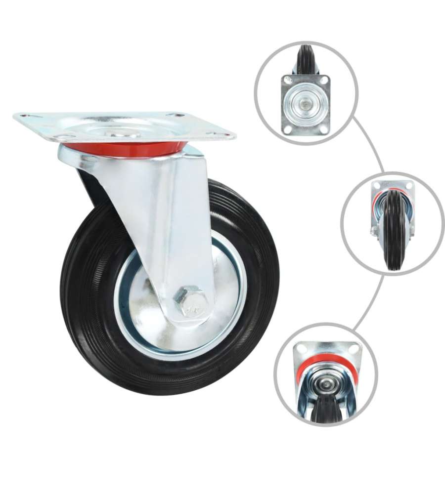 Le ruote sono realizzate in gomma, un materiale che si distingue per una buona resistenza agli urti e alle vibrazioni e che consente alle ruote di girare in modo fluido e silenzioso. La loro superficie morbida, inoltre, protegge efficacemente il pavimento dai graffi. La struttura in ferro zincato ? altamente resistente alla ruggine e garantisce maggiore robustezza e durata delle ruote. Ogni ruota ? dotata di una capacit? di carico massima di 150 kg.