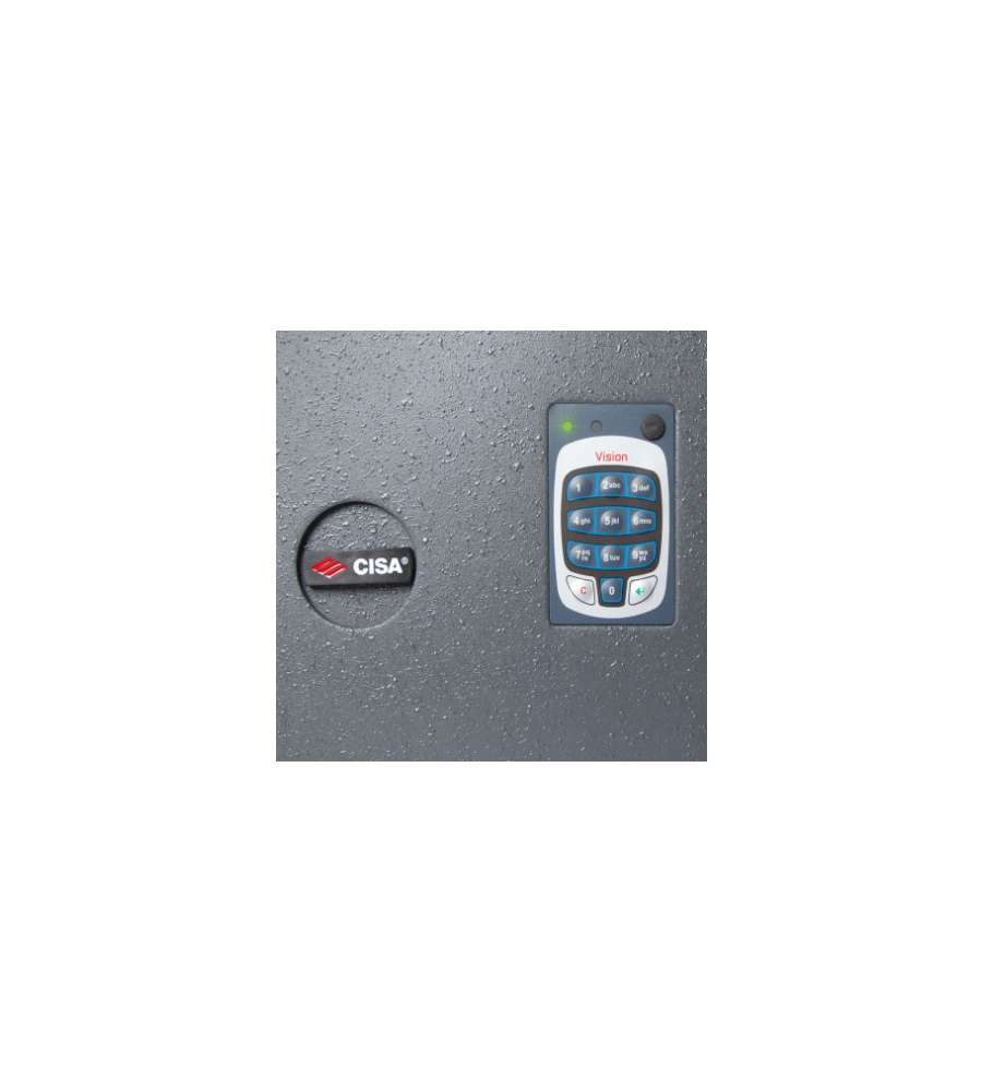 Descrizione: Cassaforte elettronica Cisa DGT Vision 42x25x30 cm, massima sicurezza. Resistente agli scassi, sicurezza avanzata con frontale in acciaio da 10 mm, catenacci da 22 mm e combinatore elettrico digitale a 12 cifre. Alimentato con pile 1,5V.