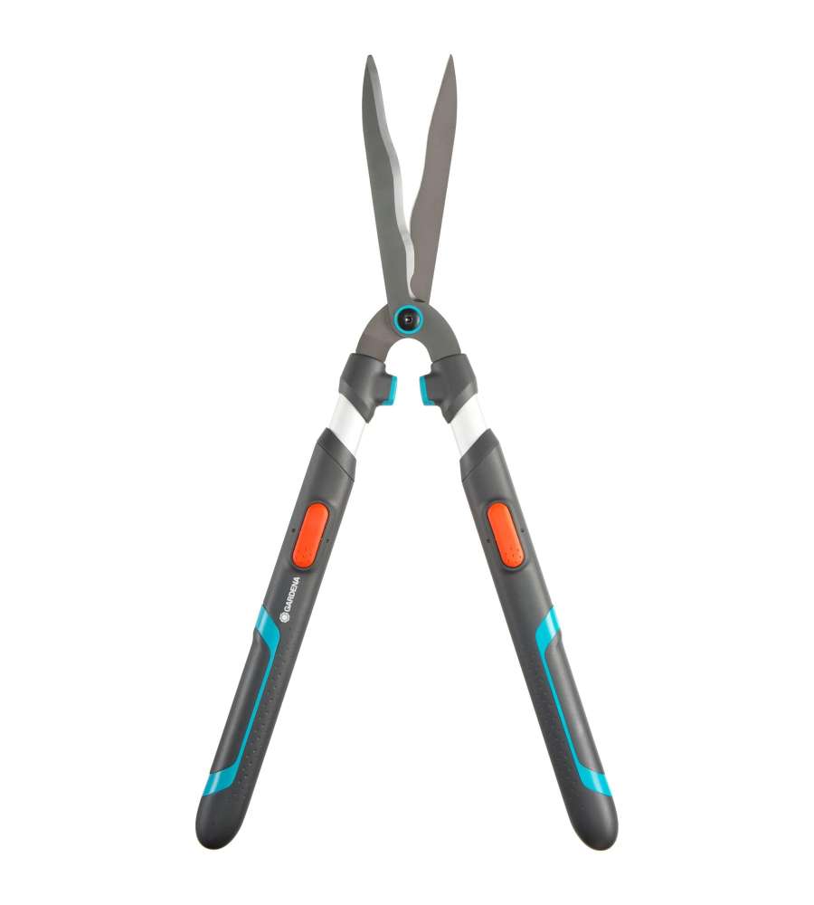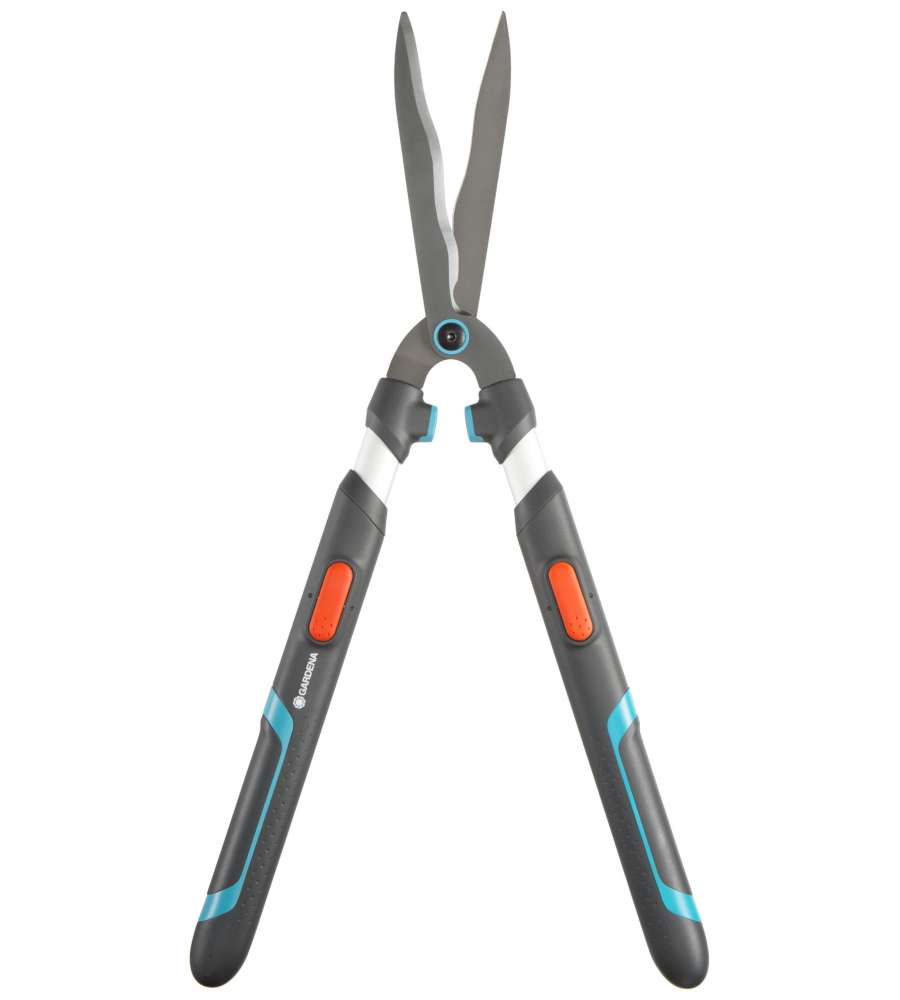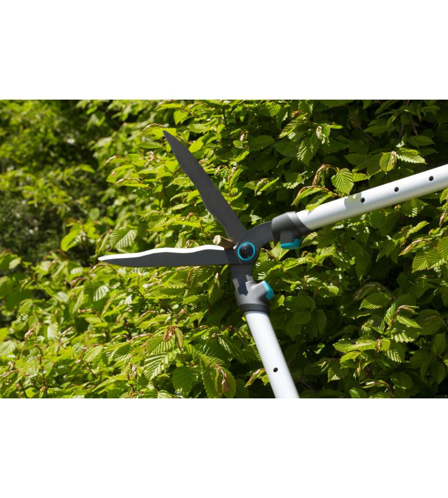 Descrizione: Cesoie per siepi TeleCut Gardena, lunghe 70-90 cm. Lame ondulate da 23 cm con rivestimento antiaderente, ideali per potare arbusti e siepi alte. Manici telescopici ergonomici per un taglio efficace.