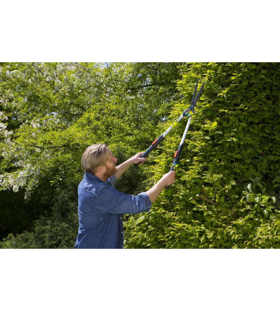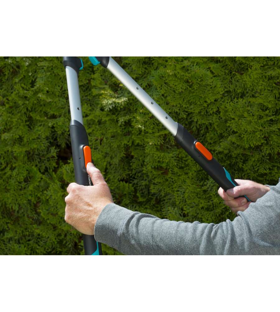 Cesoie telescopiche Gardena da 70-90 cm, lame ondulate da 23 cm con affilatura di precisione e rivestimento antiaderente. Manici ergonomici e bilanciati, ideali per potare siepi alte. Leggere e facili da usare. Garanzia 2 anni.Manico: