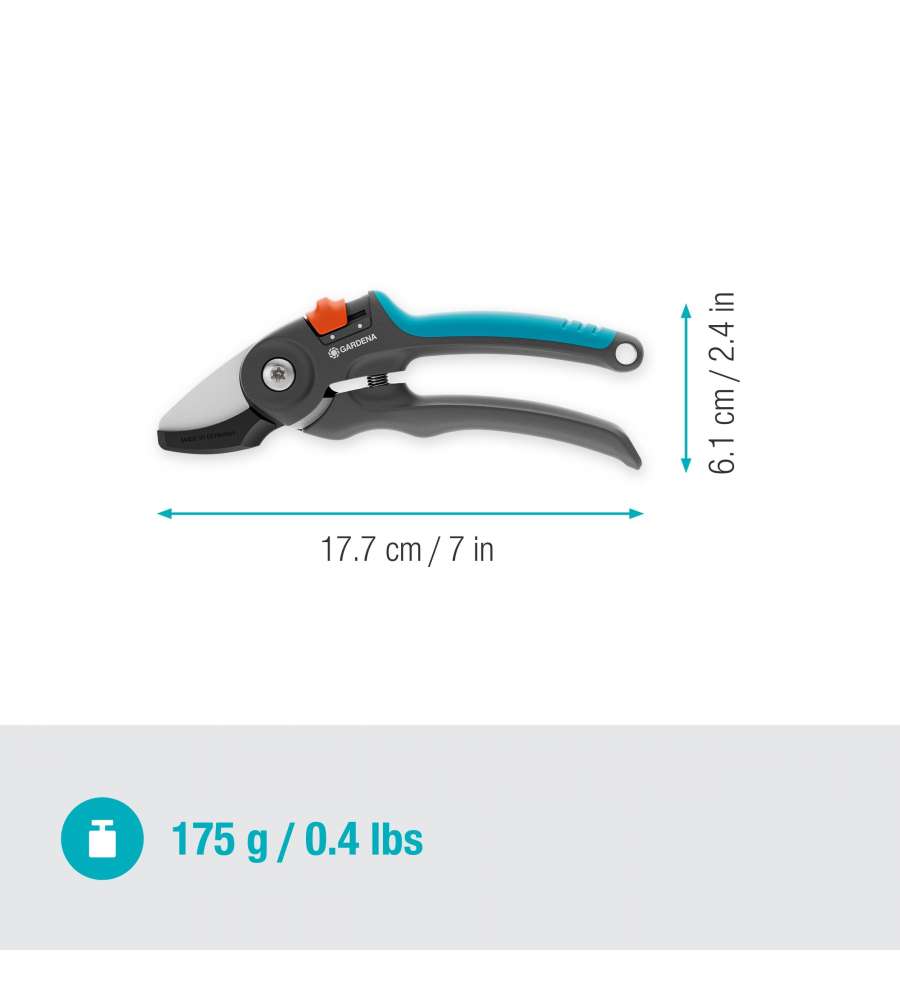 Descrizione: Forbice da giardino PremiumCut Gardena, ideale per legno secco. Design ergonomico con impugnatura soft grip, lame in lega di acciaio e diametro di taglio fino a 20 mm. Potenza e comfort assicurati!