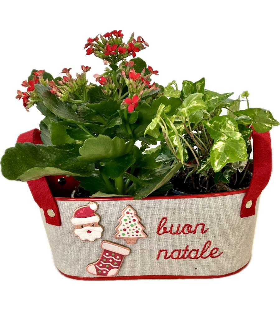 Cestino decorativo in juta con manici e bordi rossi. Include piante vive, foglie verdi e fiori rossi. Decorato con Babbo Natale, alberello stilizzato e calza della Befana. Ideale come regalo originale per Natale. Misure: 22x10 cm.