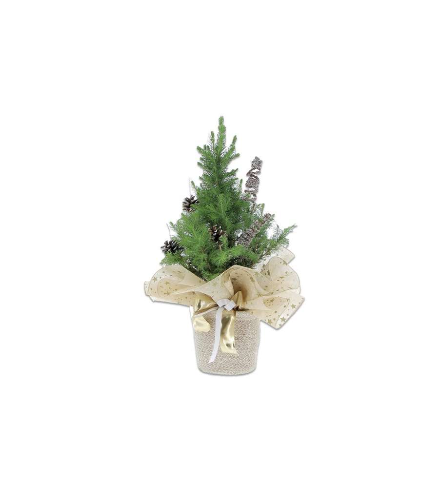 Descrizione: Piccolo alberello di Natale in vaso dal diametro di 17 cm: una vera Picea sempreverde. Decorato con pigne naturali e rametti argentati, è ideale come centrotavola o regalo festivo. Foto indicativa.