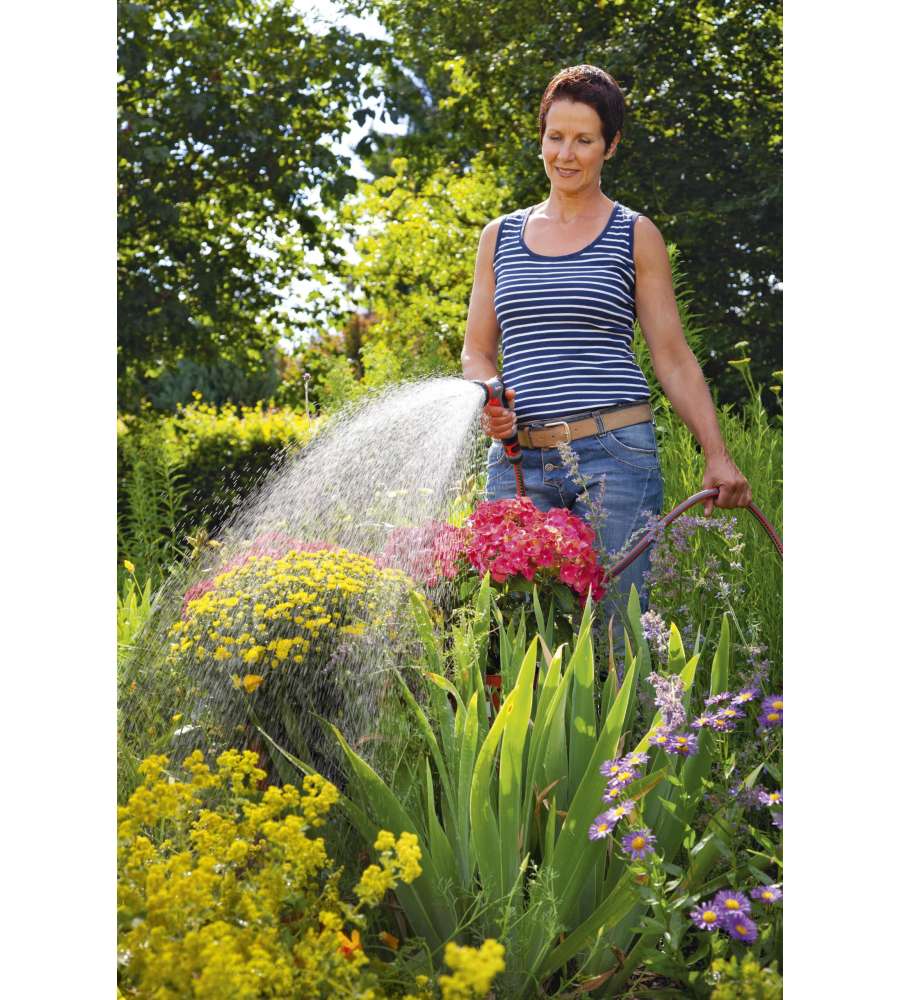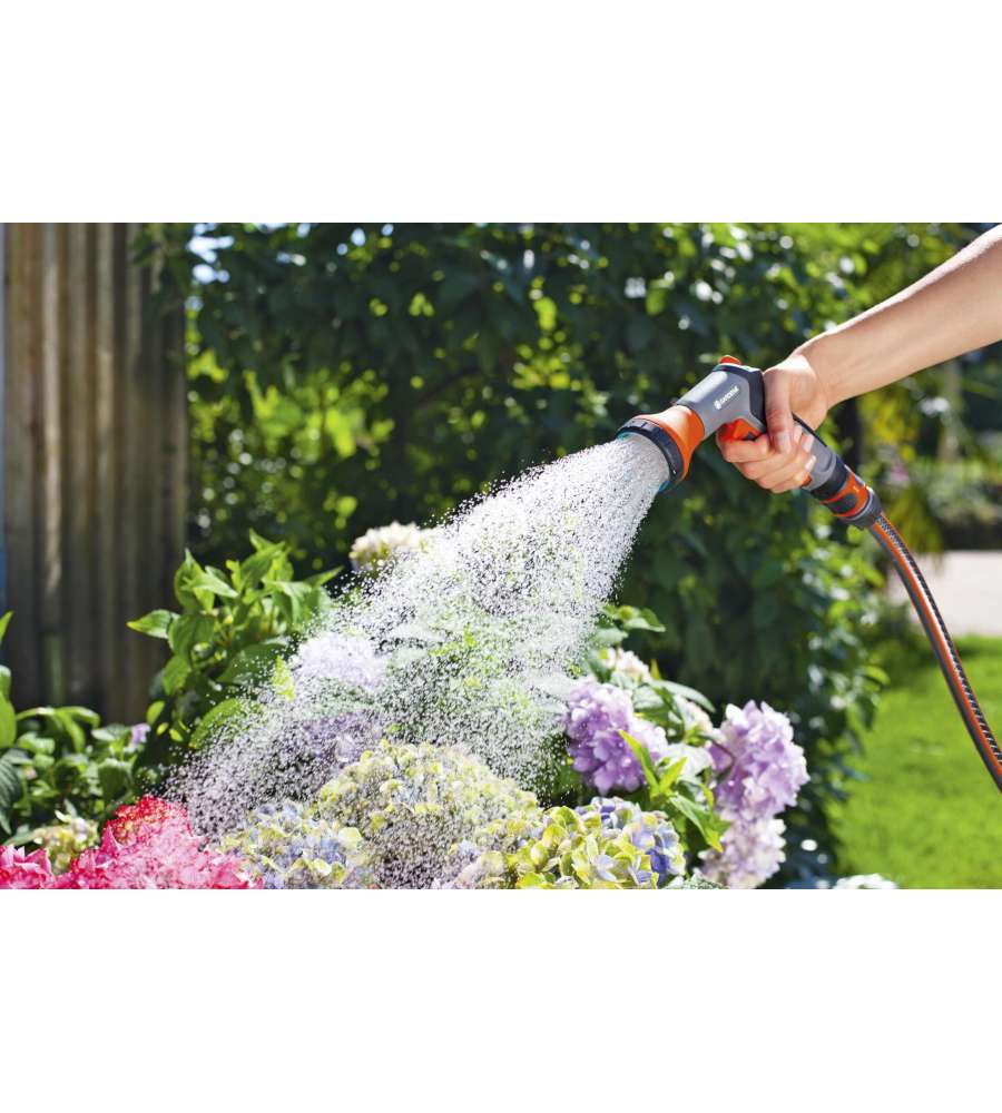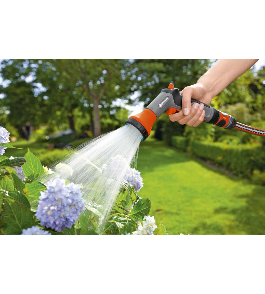 Lancia a doccia a impulsi Gardena, leggera (169 g) e resistente al gelo. Design ergonomico per un uso confortevole, flusso d'acqua regolabile e protezione da danneggiamenti. Garanzia di 2 anni. Ideale per l'irrigazione di piante e aiuole.Materiale utensile: