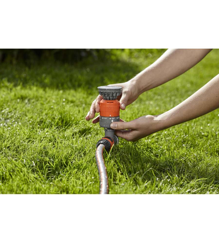 Irrigatore circolare per superfici fino a 225 m², con gittata massima di 8,5 m. Regolazione in 7 livelli (90°-360°), picchetto in metallo per stabilità, filtro a maglia fine per facile manutenzione. Design robusto e durevole.Lunghezza gittata: