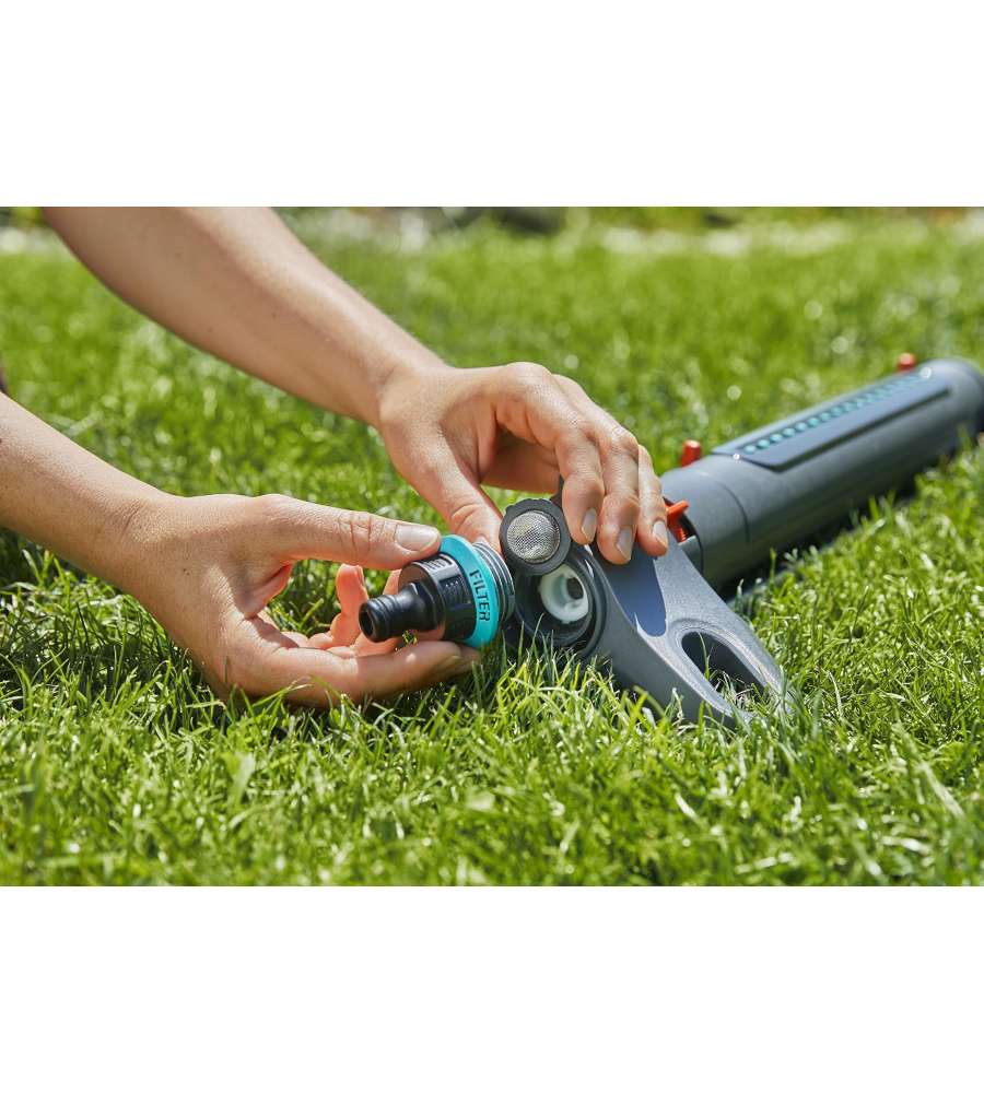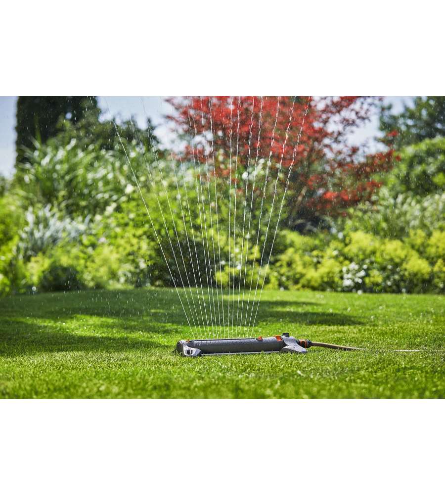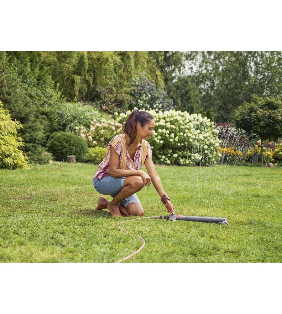 Irrigatore oscillante per superfici da 9 a 250 mq. Gittata regolabile da 7 a 17 m con larghezza del getto di 3-14 m. Robusto e antigelo, filtro metallico per una facile manutenzione. Garanzia di 2 anni. Peso: 780 g.Destinazione d'uso: