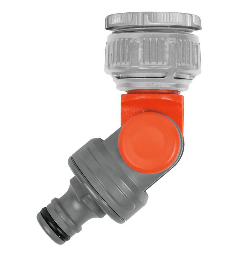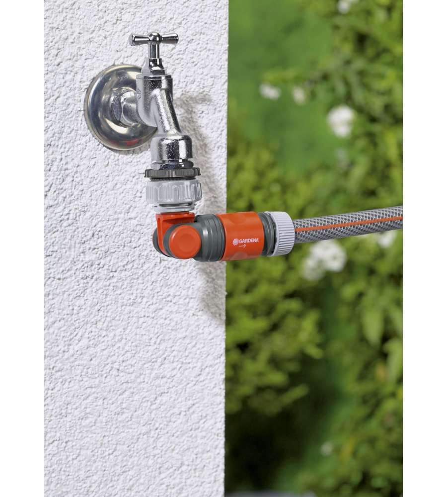 Presa rubinetto snodata 3/4" per rubinetti da 26,5 mm e 21 mm. Elemento angolato rotante che previene piegamenti del tubo. Durevole e di alta qualità, compatibile con il sistema Gardena. Garanzia di 5 anni.Dimensioni attacco: