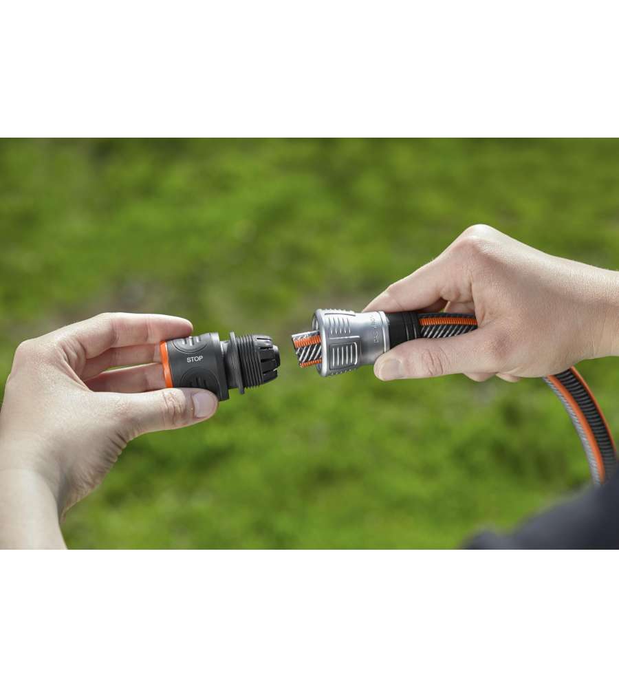 Descrizione: Raccordo acqua-stop da 19 mm (3/4") Gardena , in plastica resistente e design ergonomico. Facile da installare, previene perdite d'acqua e consente cambi rapidi di accessori. Ideale per irrigazione.
