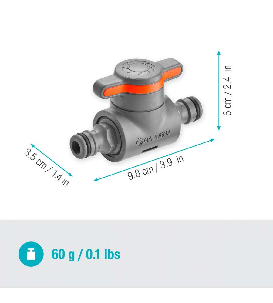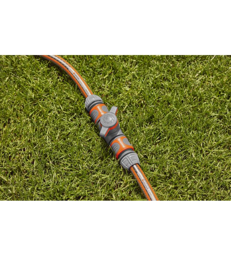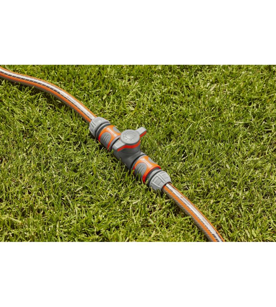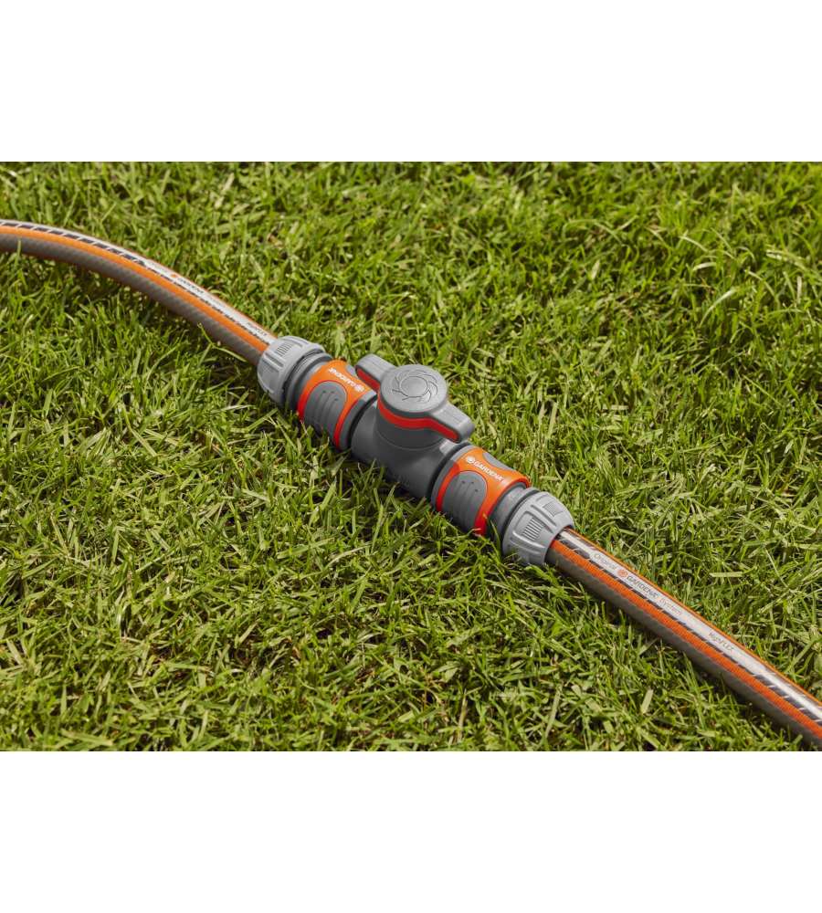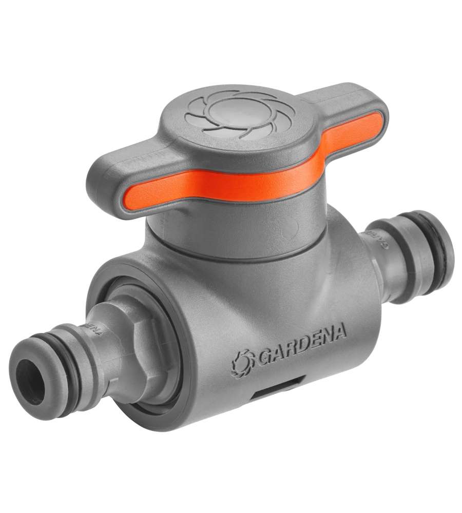 Raccordo di regolazione per tubo flessibile, consente di regolare e interrompere il flusso d'acqua. Realizzato in alluminio, ottone e plastica, con connessione filettata. Colore grigio/arancia, resistente e antigelo, ideale per l'irrigazione.Destinazione d'uso: