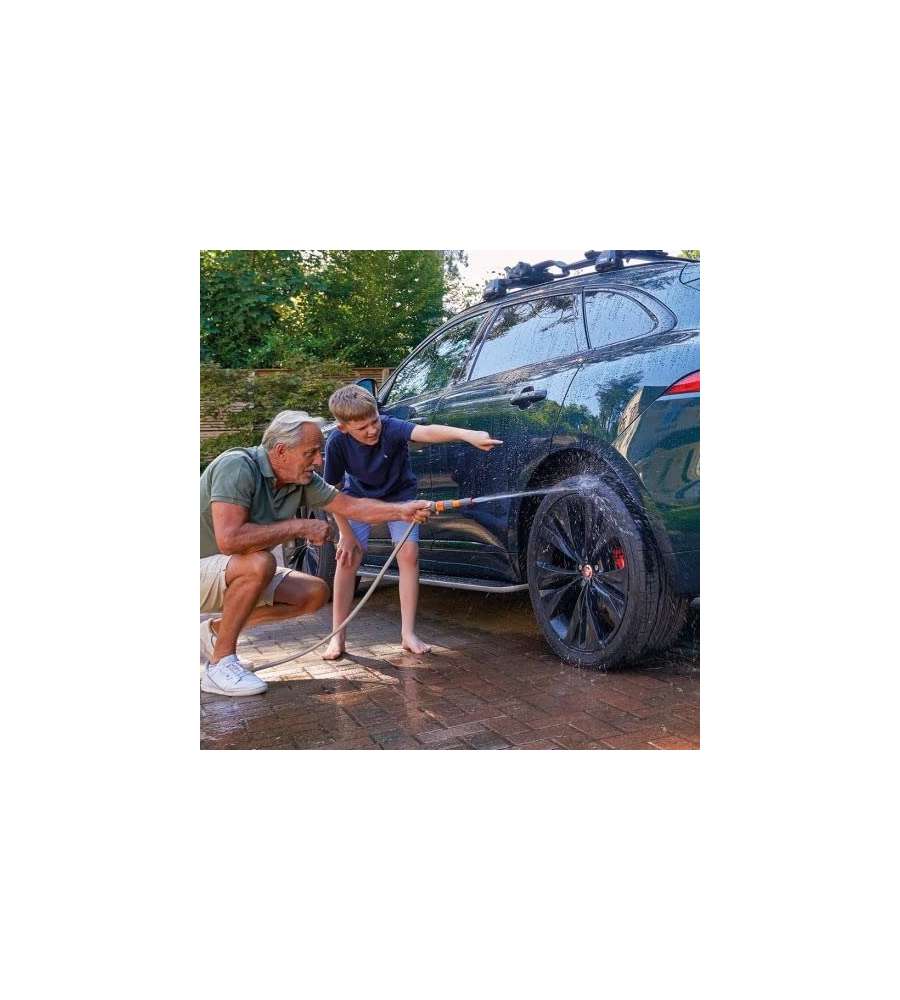 Ugello 3 in 1 versatile con 3 modelli di spruzzo per risciacquo, pulizia e irrigazione fine. Impugnature soft-touch per maggiore comfort. Include connettori per rubinetto e Aqua Stop per connessione rapida e senza perdite.