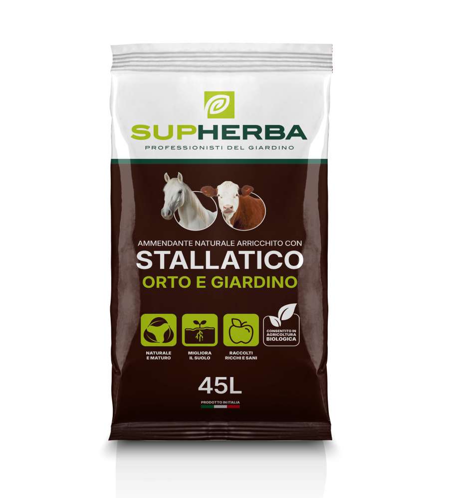 L'ammendante naturale SupHerba, arricchito con stallatico di alta qualità, è la soluzione ecologica ideale per nutrire e rigenerare il terreno del tuo orto e giardino. Completamente naturale e maturo, questo prodotto migliora la struttura e la fertilità del suolo, favorendo lo sviluppo di radici forti e garantendo raccolti ricchi, sani e abbondanti. È perfetto per preparare il terreno prima delle semine o dei trapianti, assicurando alle tue piante tutto il supporto di cui hanno bisogno per crescere rigogliose.