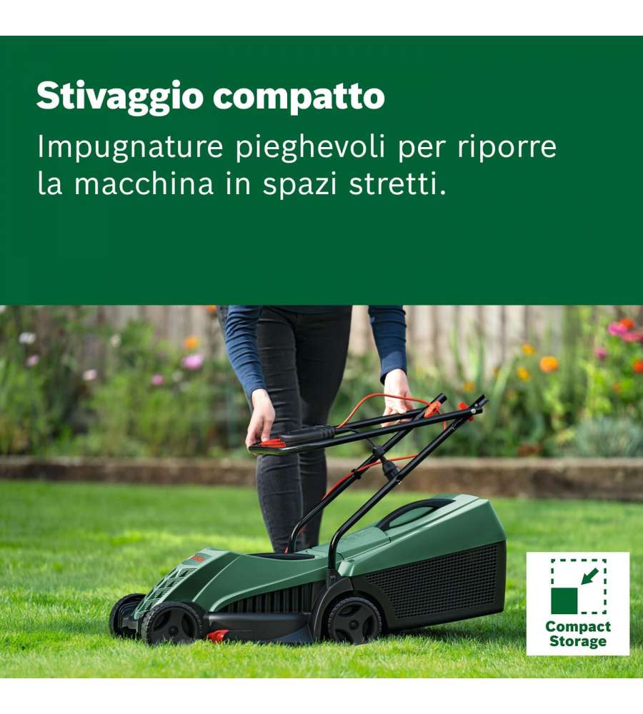 Descrizione: Rasaerba Bosch EasyRotak, larghezza di taglio 32 cm, leggero e maneggevole. Offre un taglio preciso fino ai bordi grazie ai pettini per erba. Motore potente da 1200 W, cesto raccoglierba da 31 l e impugnature pieghevoli per un facile stoccaggio.