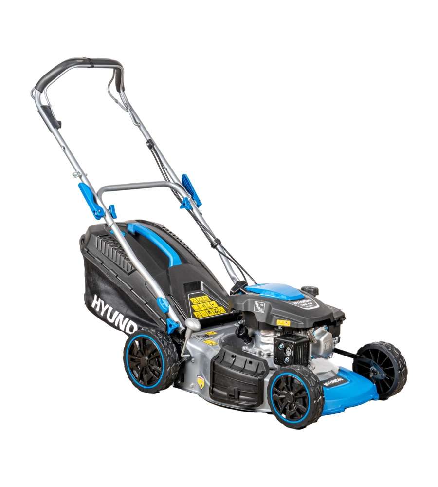 Tagliaerba a scoppio Hyundai 3,5 HP, cilindrata 150 cc, larghezza di taglio 430 mm. 7 altezze di taglio (25-75 mm), sacco da 45L. Trazione, ruote maggiorate e impugnatura soft grip per comfort. Ideale per giardini medi.Velocità massima: