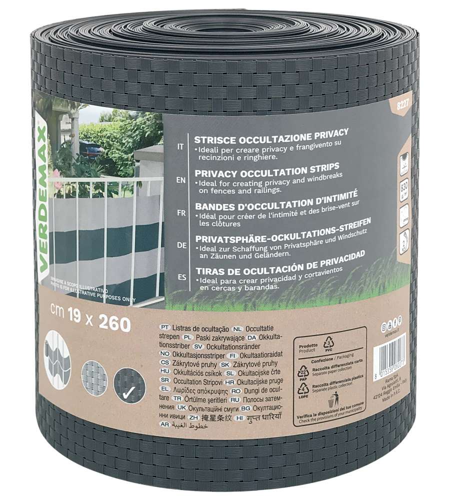 Striscia occultazione Privacy 19x260 cm in antracite, ideale per proteggere la privacy. Materiale resistente con trattamento anti U.V., facile da installare e adattabile, perfetta per esterni. Copertura ottimale e design elegante.Uso esterno: