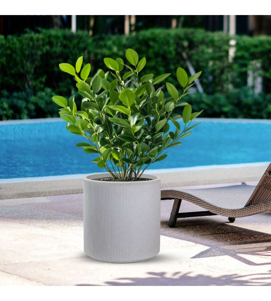 Descrizione: Vaso cilindrico Modigliani in resina beige, elegante e resistente. Dimensioni: d.36 x h.35 cm. Ideale per esterni e interni, resistente a urti, temperature estreme e raggi UV. 100% riciclabile.