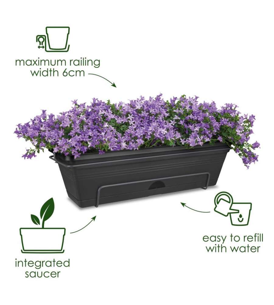 Fioriera per balcone Elho, adatta a ringhiere fino a 6 cm di larghezza. Include sottovaso integrato, apertura laterale per innaffiatura facile. Realizzata in plastica 100% riciclata, resistente a gelo e sporco, con garanzia di 2 anni. Colore stabile.Capienza: