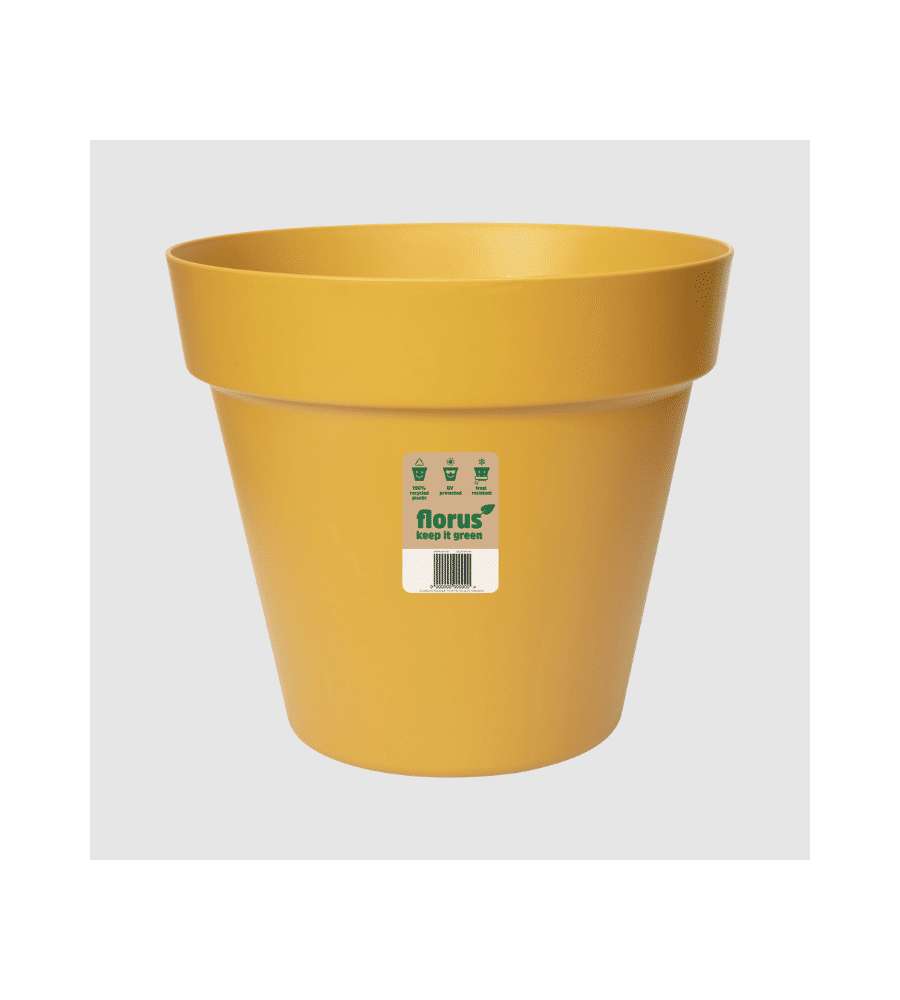 Vaso rotondo da 35 cm, design moderno e pulito in colore mustard. Bordo robusto, adatto per interni ed esterni. Dimensioni: 34x34x30.6 cm, capacità 16 litri. Perfetto per valorizzare qualsiasi ambiente con stile contemporaneo.Capienza: