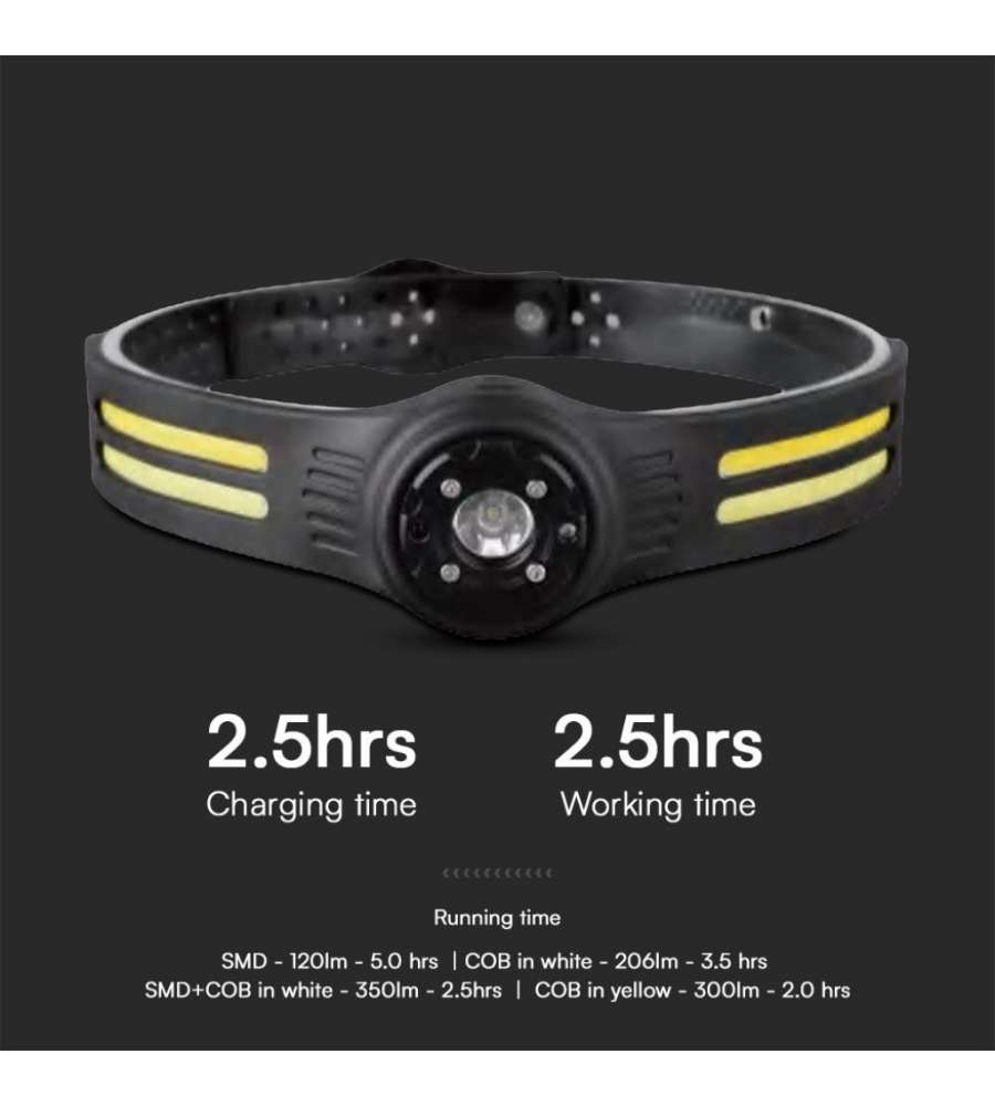 V-TAC Torcia LED Frontale 3W SMD+5W COB 470lm Batteria Ricaricabile USB C IP43