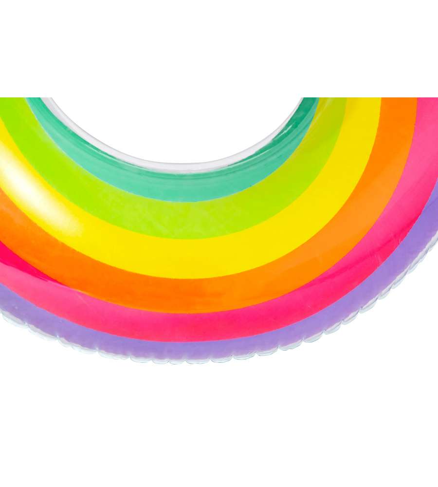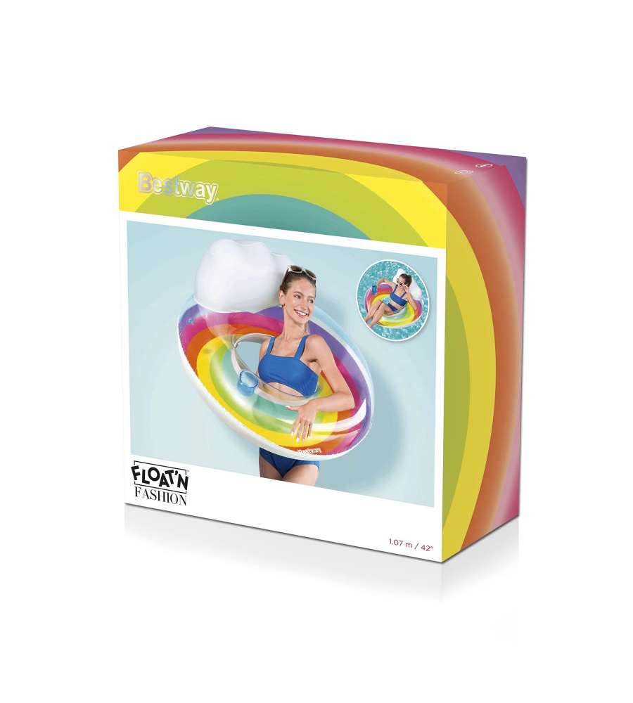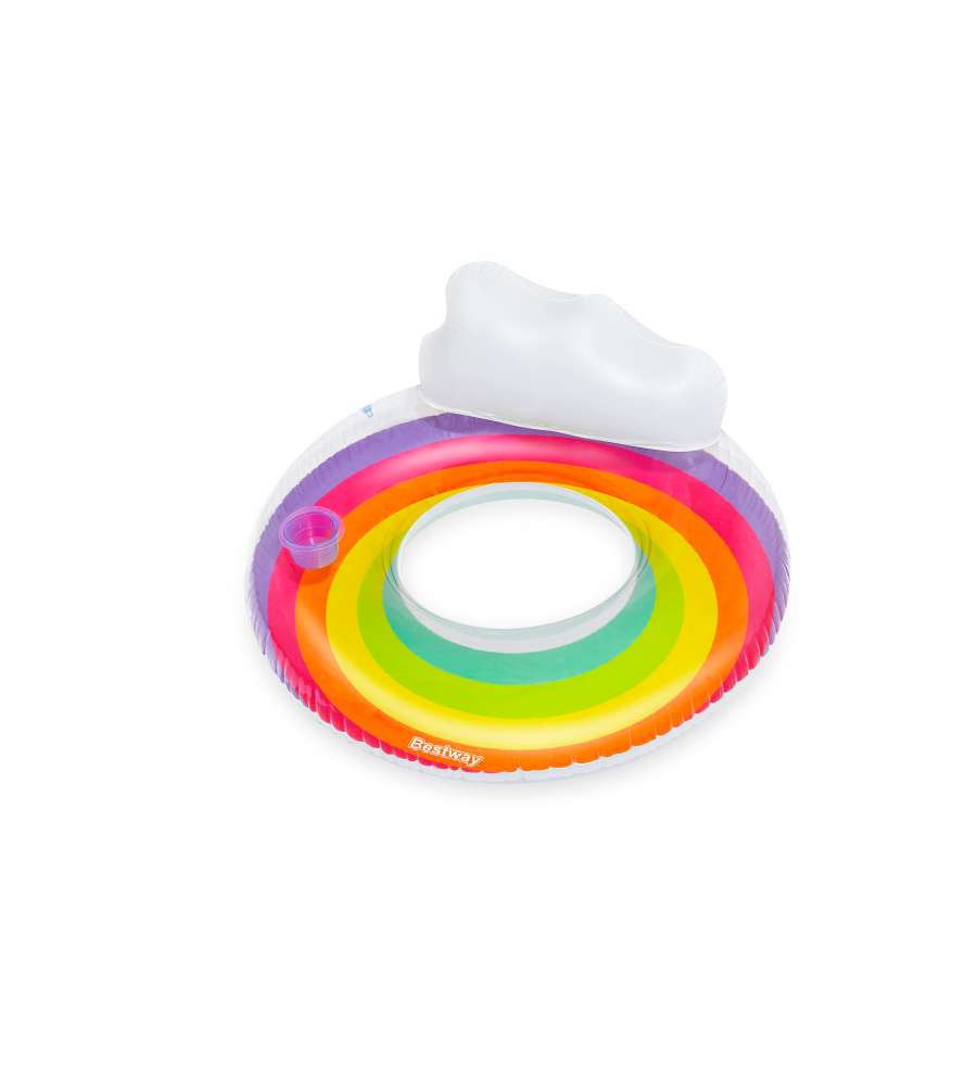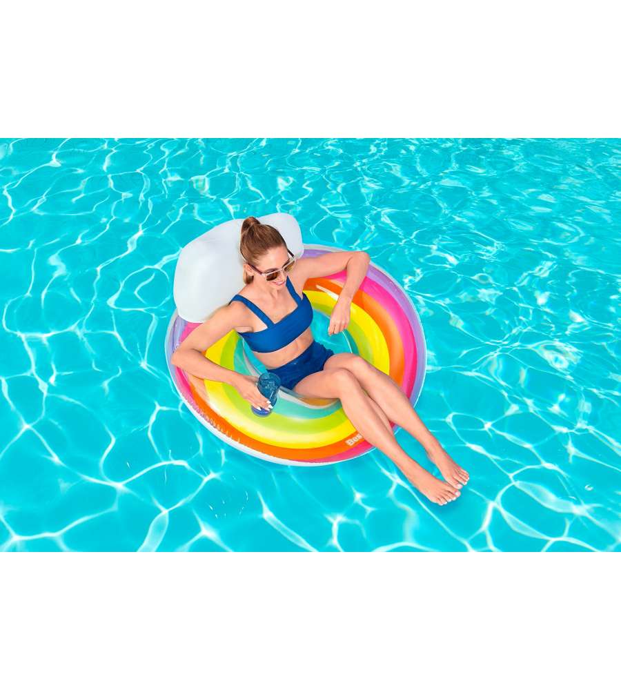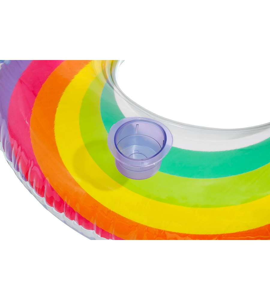 Poltrona gonfiabile Rainbow, diametro 107 cm, design arcobaleno colorato, include portabicchiere e poggiatesta a nuvola. Materiale resistente e durevole. Ideale per bambini.