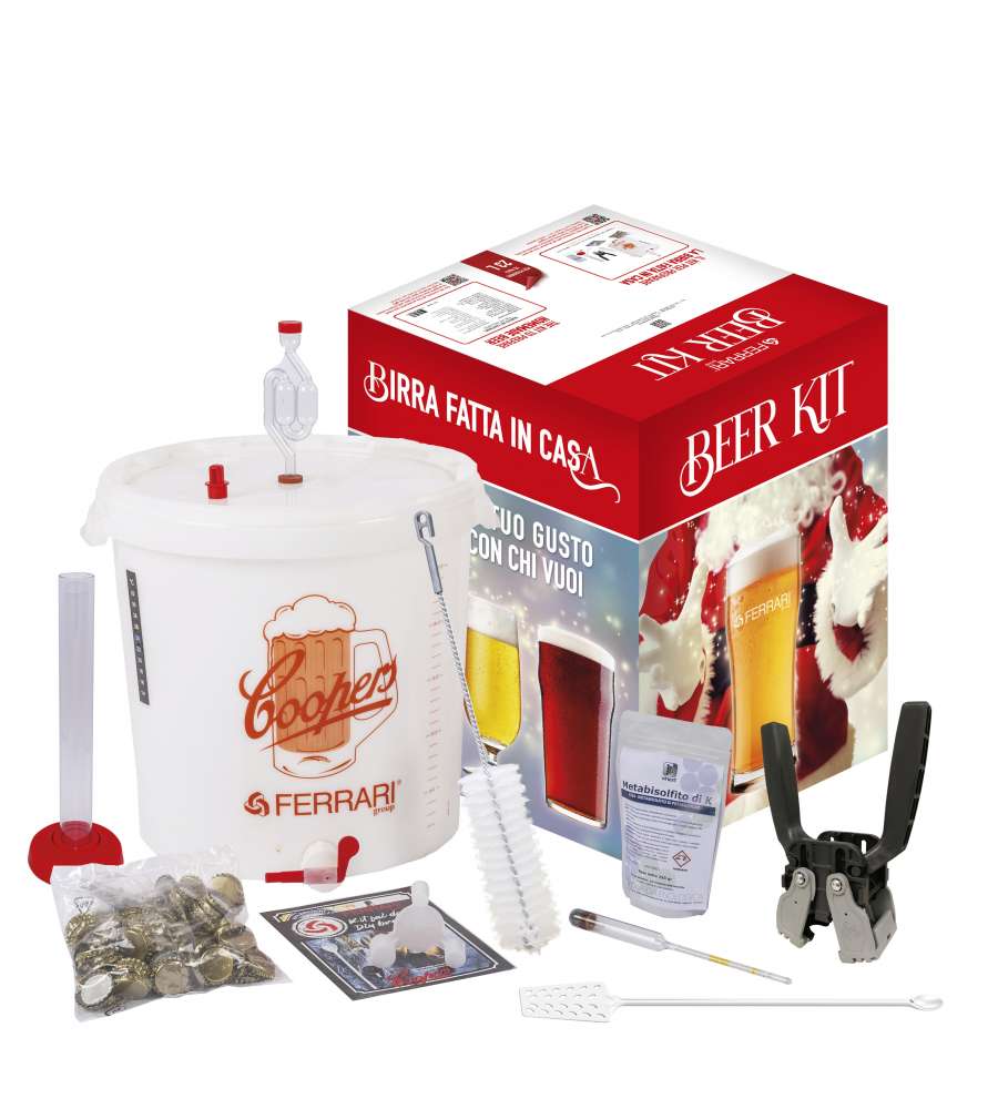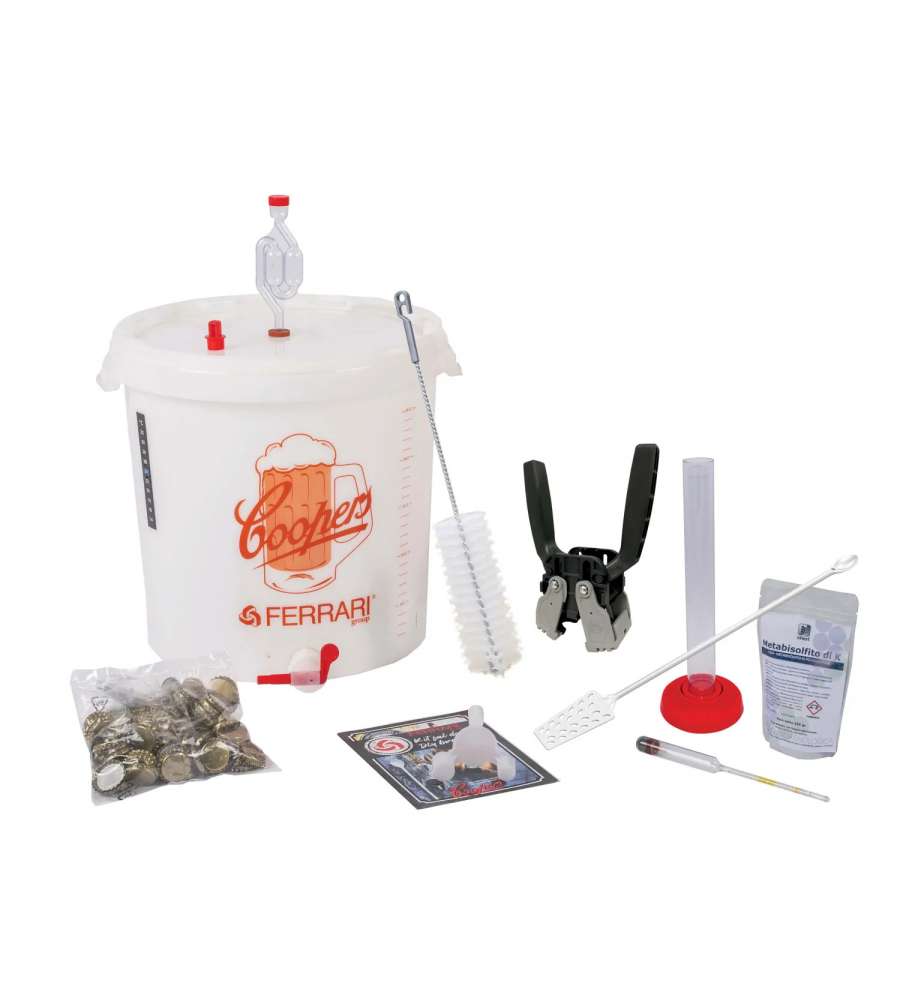 Kit completo composto da: fermentatore in plastica, termometro adesivo, rubinetto con antisedimento, minifermentatore, dosatore, densimetro, lavabottiglie, sanificante, 100 tappi corona 26 mm, capsulatrice. Riutilizzabile.Destinazione d'uso: