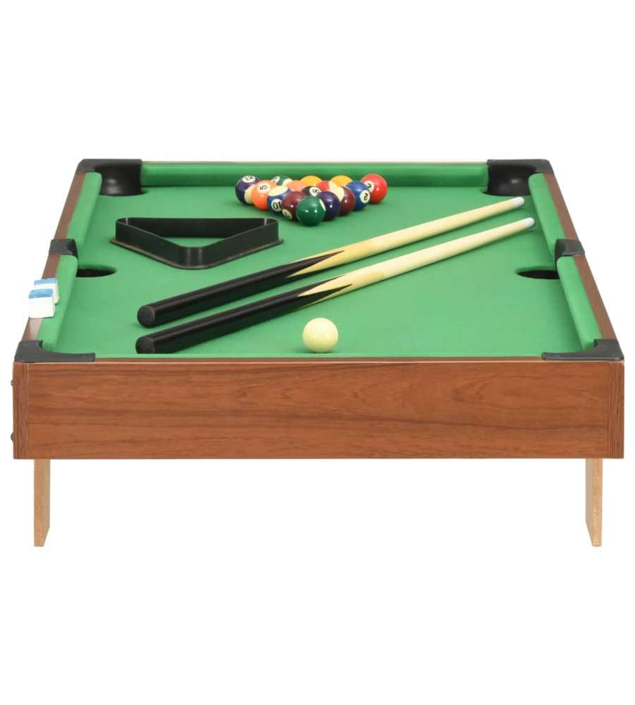 Colore: Marrone e verde Materiale: MDF Dimensioni: 92x52x19 cm (LxPxA) Dimensioni del campo di gioco: 86x46 cm (LxP) Include 6 buche Può essere posizionato su qualsiasi tavolo normale Adatto per 6 anni e oltreAltro 1: