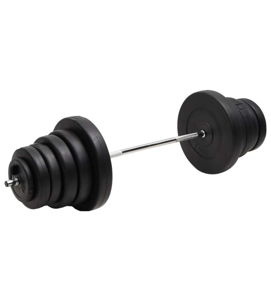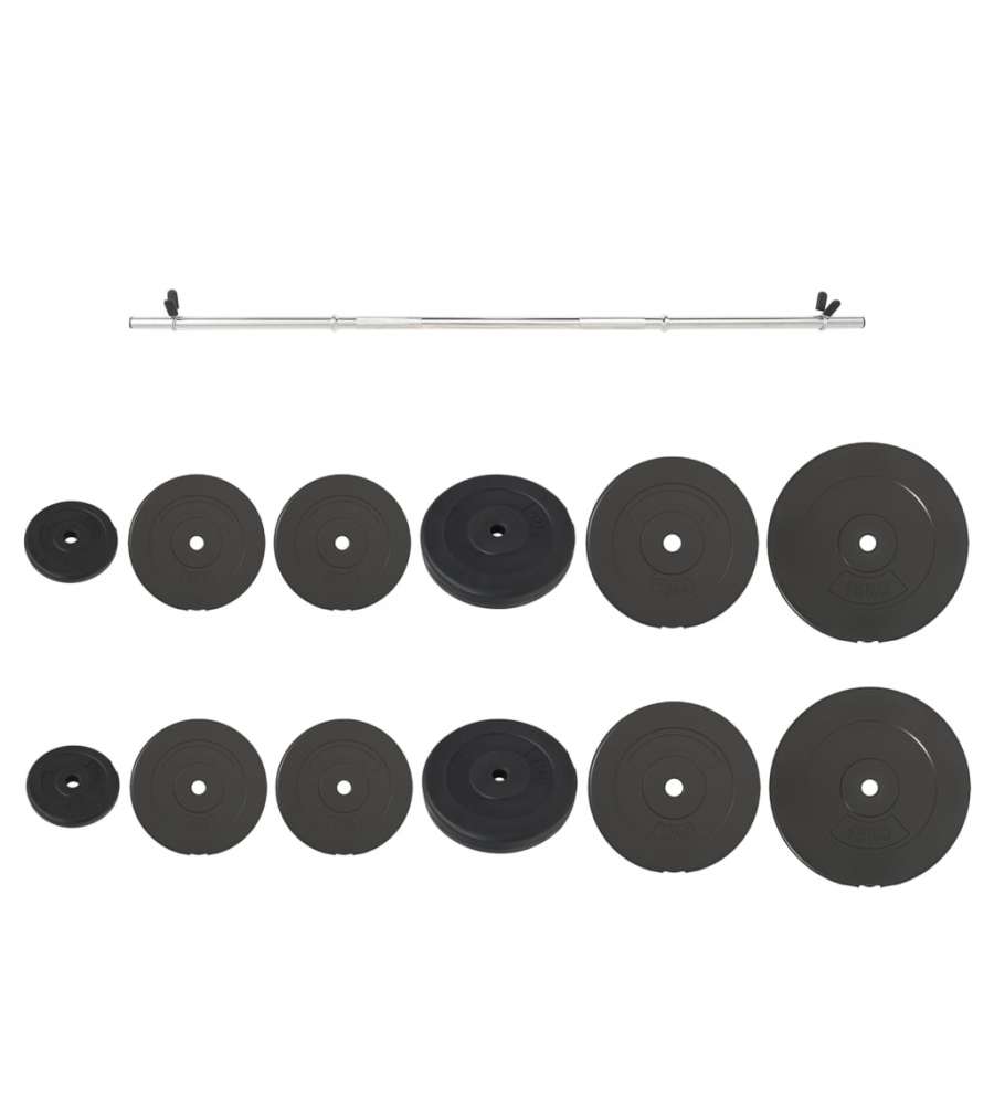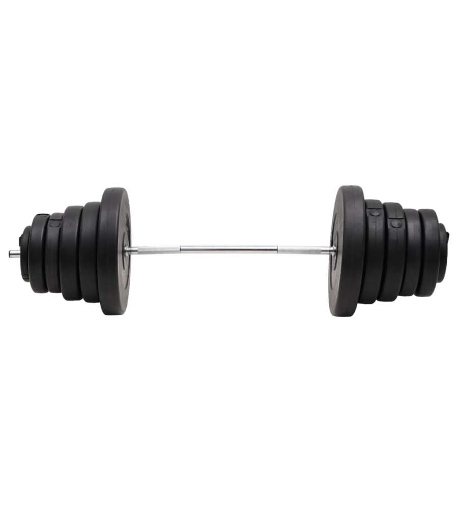 Colore: Nero Materiale: Cemento con rivestimento in plastica, dischi in cemento, barre in acciaio Diametro dei dischi da 15 kg: 39 cm Diametro dei dischi da 10 kg: 31 cm Diametro dei dischi da 7,5 kg: 30 cmAltro 1: