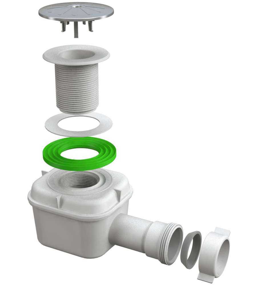 Sifone "splash" per doccia, corpo in polipropilene, piletta plastica. Scarico filettato 1"1/2, ghiera e guarnizione conica incluse. Flangia piletta Ø 80 mm, coperchio cromato per una finitura elegante e curata.Altro 1: