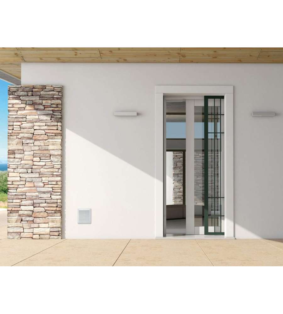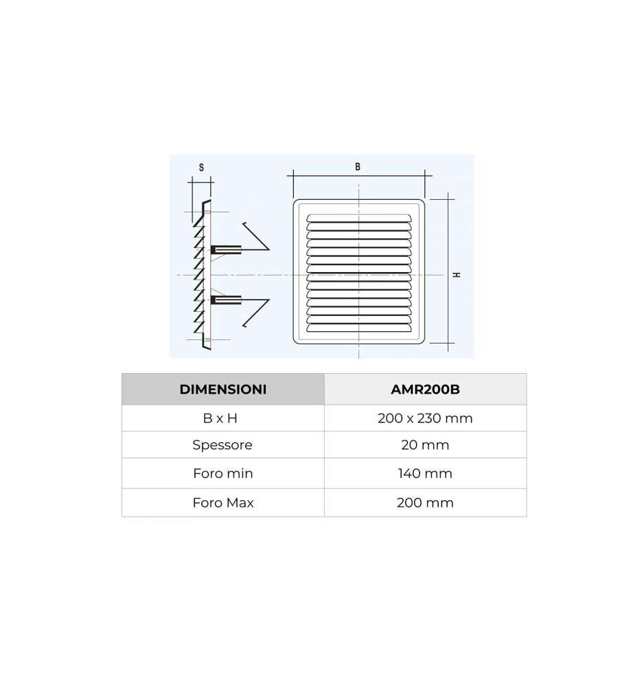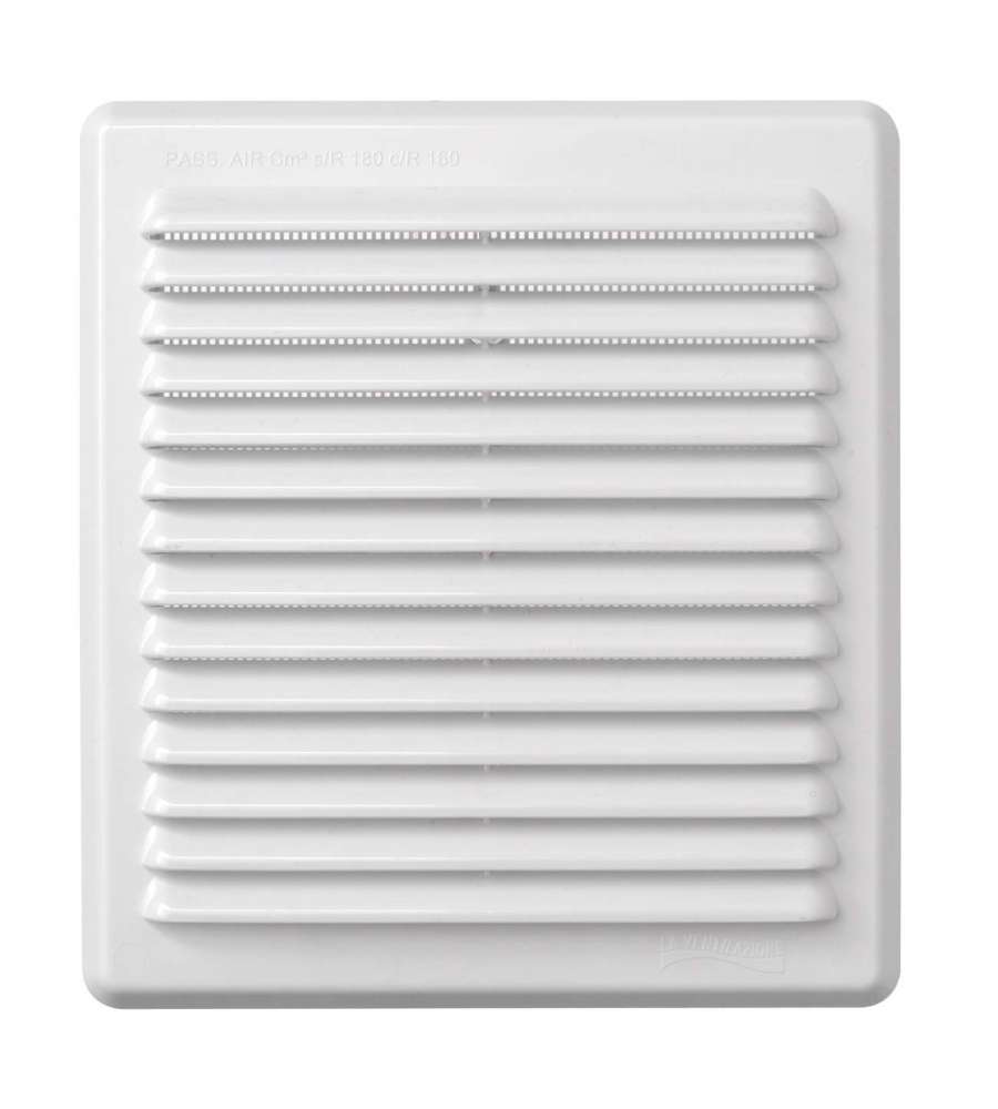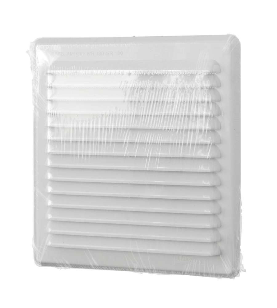 Griglia di areazione in plastica bianca, dimensioni 204x230 mm, spessore 20 mm. Rete antinsetti inclusa e sistema di incastro a molle per facile installazione. Passaggio aria ottimizzato di 180 cm², compatibile con fori da 140/200 mm.Garanzia: