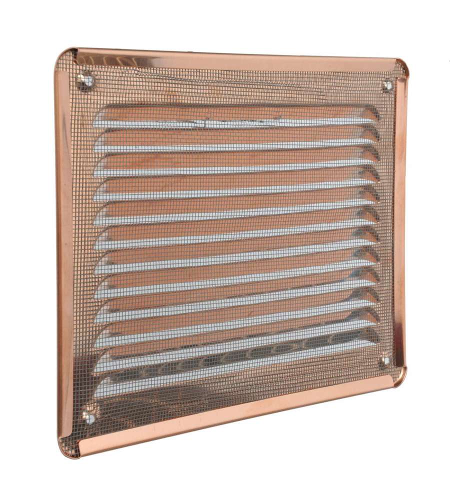 Griglia in rame da sovrapporre 193x165 mm, spessore 8 mm. Include rete antinsetti, passaggio aria 115 cm². Resistente e dal design elegante, ideale per ventilazione interna ed esterna, garantisce sicurezza e comfort.Garanzia: