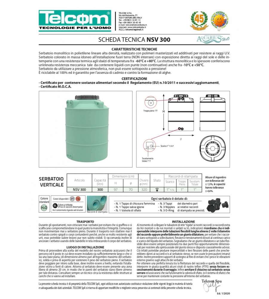 Serbatoio colorato in massa idoneo all’installazione fuori terra (NON interrare) con esposizione diretta ai raggi del sole e delle intemperie con una resistenza termica agli sbalzi di temperatura fra -60C e +80C.I dati sottostanti riguardano la sede legale e le Informazioni correlate del produttore del prodotto.