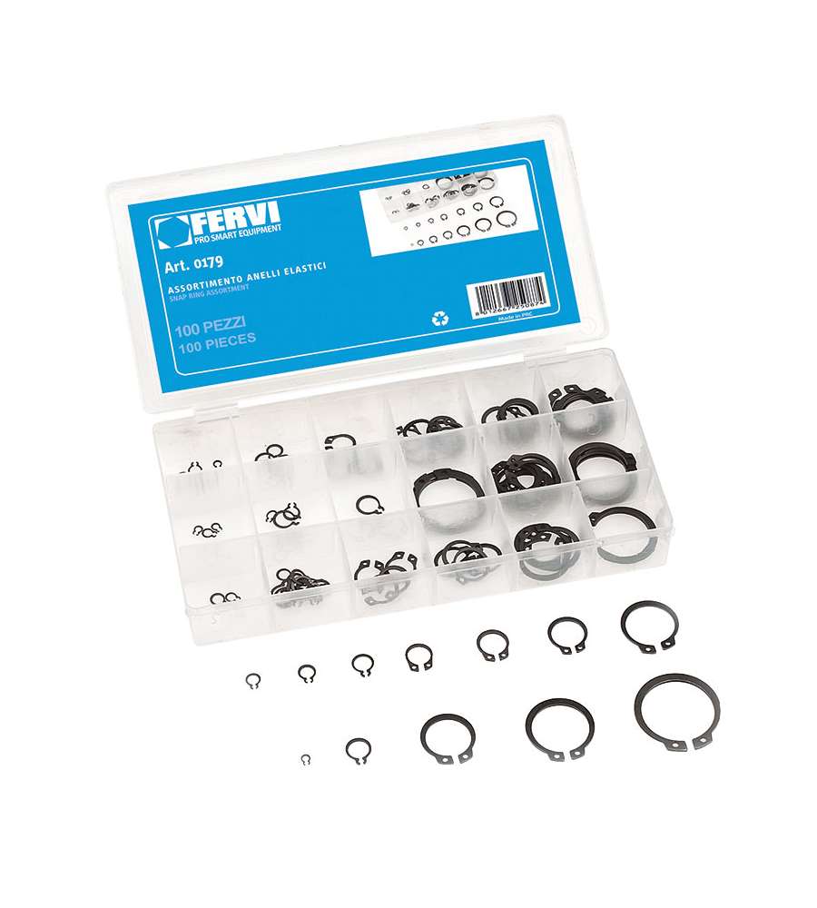 Descrizione: Set di 100 anelli elastici Fervi in acciaio, per bloccaggio meccanico. Resistenza e versatilità sono garantite. Ideali per alberi di trasmissione, semiassi e tubi. Misure da 6 a 32 mm.