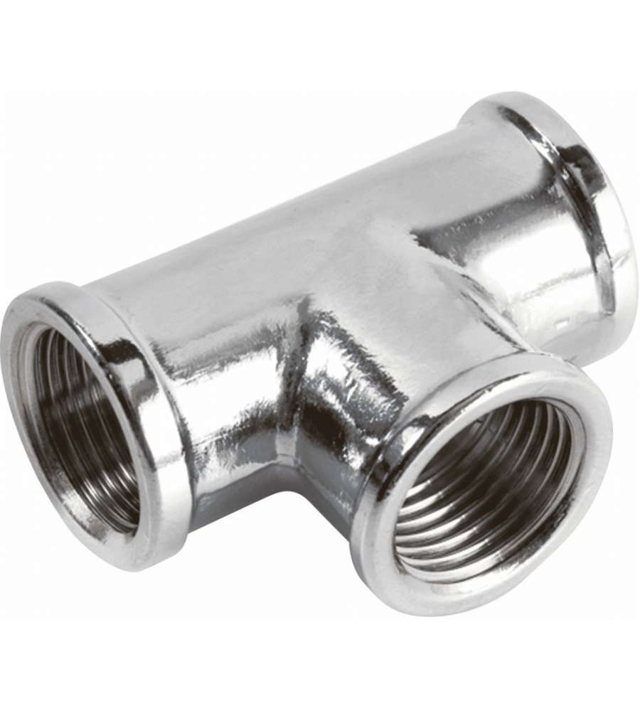 Raccordo a "T" in ottone cromato 3/4'' FFF, ideale per lavorazioni esterne. Elevata resistenza a ruggine e corrosione, superficie liscia e brillante per un aspetto estetico gradevole. Perfetto per collegamenti pratici e duraturi.Altro 1: