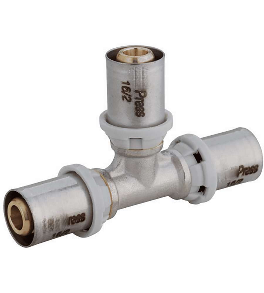 Raccordo a "T" a pressare per multistrato Ø 16x16x16 mm, dotato di 2 O-ring in EPDM per una tenuta stagna. Installazione rapida e sicura con pochi attrezzi, ideale per derivazioni in sistemi multistrato.Altro 1: